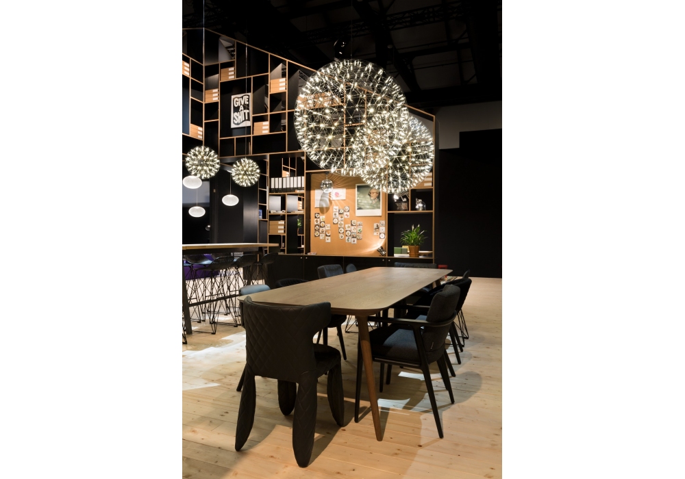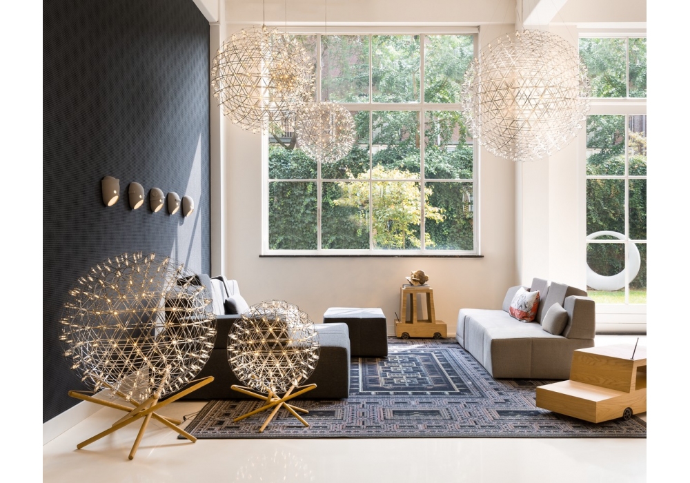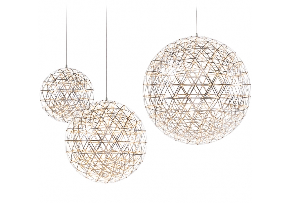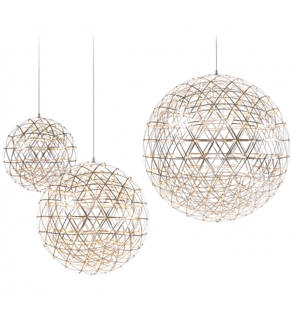 Raimond II von Raimond Puts für Moooi entworfen, ist eine dimmbare Pendelleuchte aus Edelstahlkugel mit PMMA-Linsen. Erhältlich in drei Größen: ø 43 cm mit 92 LEDs, ø 61 cm mit 162 LEDs und ø 89 cm mit 252 cm. Transparentes Kabel.