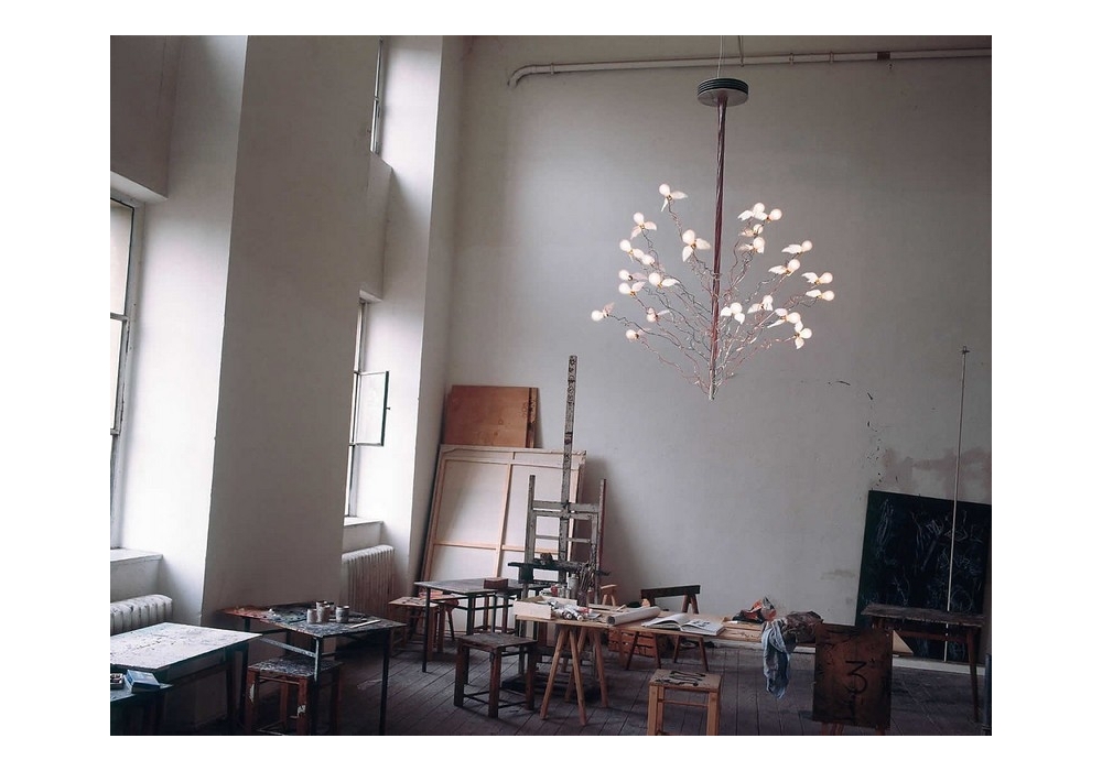 Birds Birds Birds, entworfen und hergestellt von Ingo Maurer, ist eine Hängeleuchte mit 24 geflügelten LED-Glühbirnen mit Gänsefedern. Die Leuchtmittel sind individuell einstellbar.