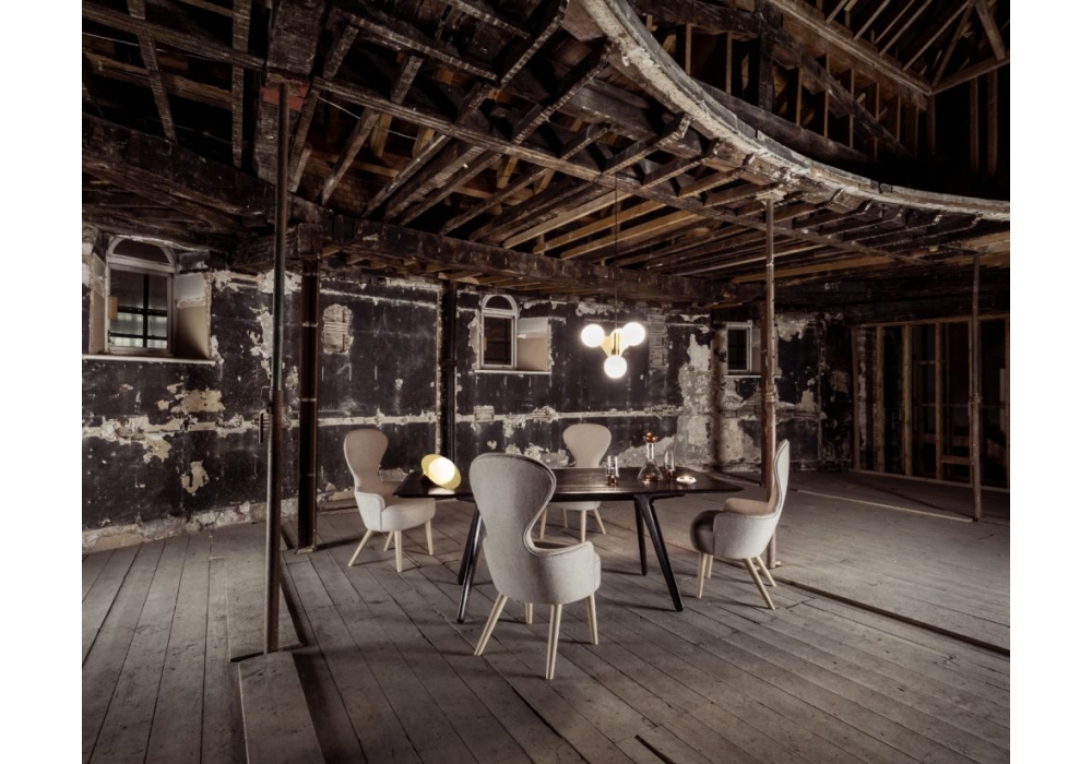 Plane Short von Tom Dixon entworfen, ist ein Kronleuchter, der aus einem messingbeschichteten Stahlrahmen und einer zweilagigen weißen Glaskugel besteht. Schwarzes geflochtenes Kabel.