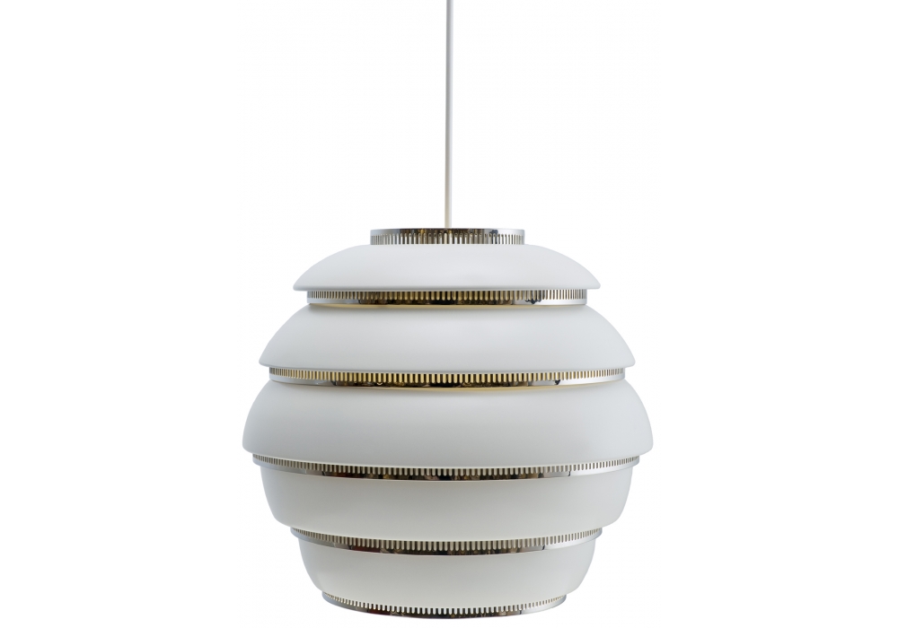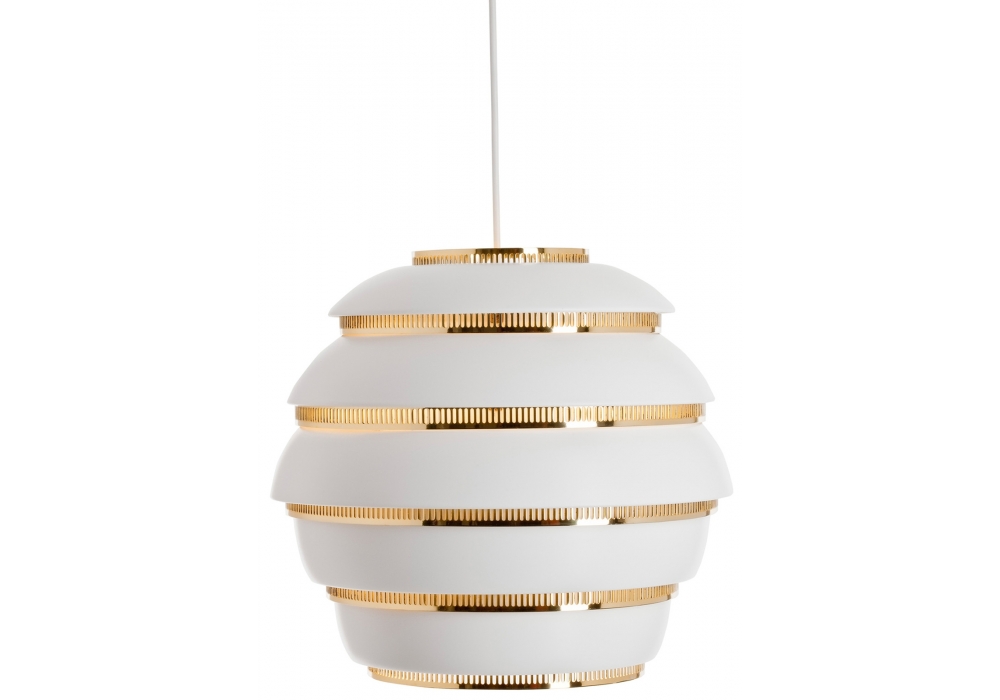 The A331 Pendant Lamp, designed by Alvar Aalto for Artek, signature shape consists of white aluminium shade and polished brass plated steel rings that filter the light in the most beautiful manner. The elegant Beehive is a tasteful addition to any room.