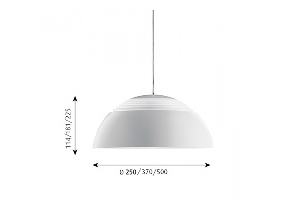 AJ Royal von Arne Jacobsen für Louis Poulsen entworfen, ist eine abgerundete Hängeleuchte mit einer geriffelten Oberfläche. Die Struktur ist aus schwarz oder weiß lackiertem Aluminium. Der Diffusor ist aus satiniertem Acryl und schirmt eine dimmbare LED-Lichtquelle in verschiedenen Modellen und Lichtschattierungen ab. AJ Royal ist in verschiedenen Größen erhältlich.