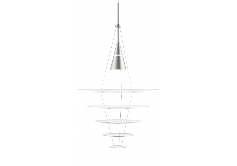 Enigma 545 von Shoichi Uchiyama für Loius Poulsen entworfen, ist eine Hängeleuchte mit Struktur und Leuchtenkörper aus schwarz lackiertem Aluminium. Die reflektierenden Schirme sind konzentrische Kreise aus weißem oder schwarzem Acryl und schirmen eine LED- oder Halogen-Lichtquelle vom Typ GU10 ab. Enigma 545 ist in verschiedenen Ausführungen erhältlich.