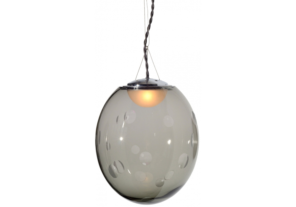 Kaline von Atelier Areti entworfen, ist eine Pendelleuchte. Das mundgeblasene Kristallglas besteht aus zwei Schichten, einer dicken transparenten und einer farbigen dünneren Schicht. Kreise werden in beide Schichten geschnitten, wodurch viele Linsen entstehen, die die Oberfläche bedecken. Glühbirne und Transformator enthalten.
