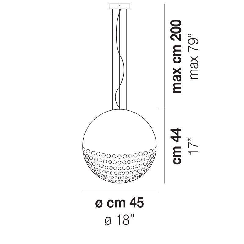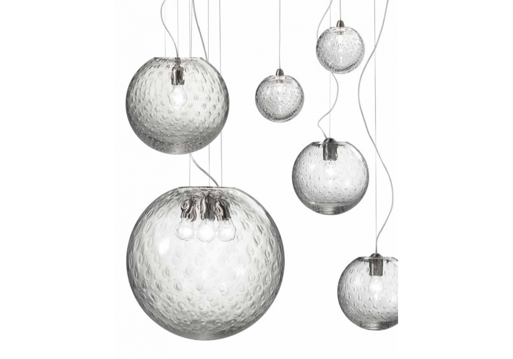 Bolle, von Barbara Maggiolo für Vistosi entworfen, ist eine Hängeleuchte mit tragender Struktur aus nickelfarben lackiertem Metall. Der Diffusor besteht aus kugelförmigem Glas mit einer unregelmäßigen Oberfläche in den Ausführungen Weiß/Blase oder Kristall/Blase. Die Lichtquelle ist Halogen dimmbar in verschiedenen Lichtschattierungen. Bolle ist in verschiedenen Modellen erhältlich.