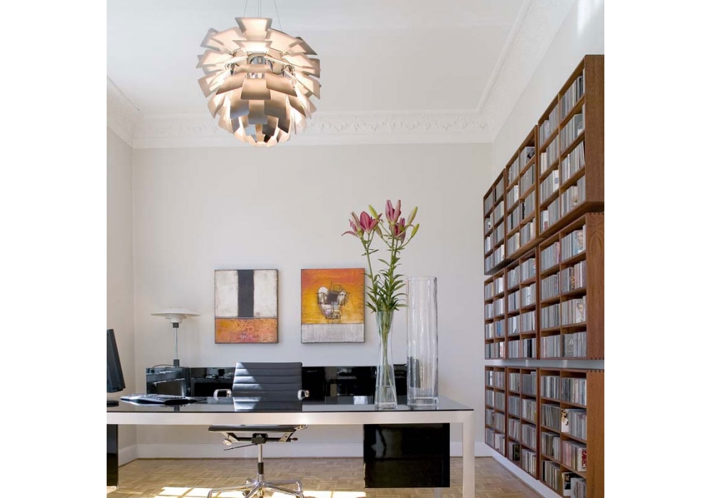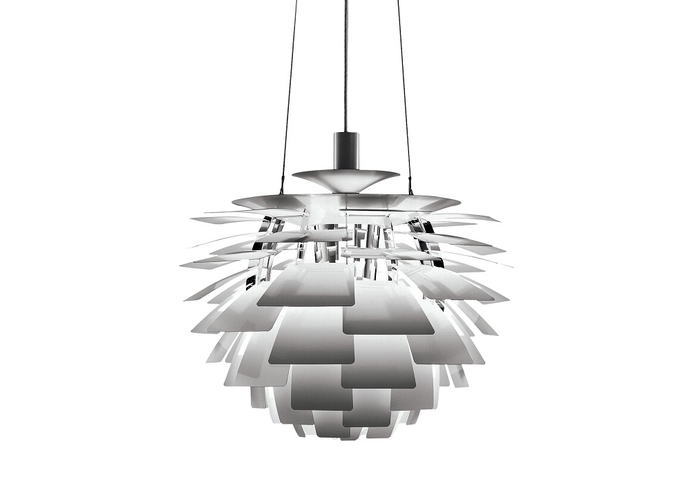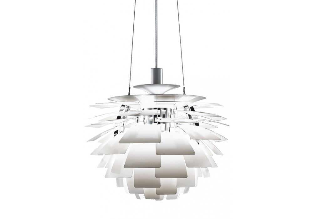 PH Artichoke von Poul Henningsen für Louis Poulsen entworfen, ist eine Hängeleuchte mit verchromtem Stahlrahmen, der mit 72 lasergeschnittenen Blechen verankert ist. Die Diffusoren sind zwei aus weiß oder schwarz lackiertem Stahl und schirmen eine LED- oder Halogenlichtquelle in der dimmbaren oder Standardversion ab. PH Artichoke ist in verschiedenen Ausführungen, Größen und Ausführungen erhältlich.