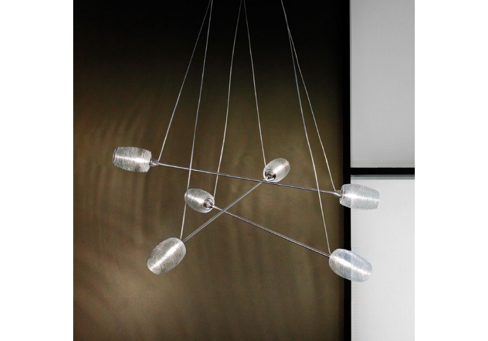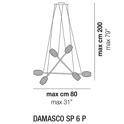 Damasco von Paolo Crepax für Vistosi entworfen ist eine Hängeleuchte mit tragender Struktur aus nickelfarben lackiertem Metall. Der Diffusor besteht aus Kristall mit unregelmäßiger Oberfläche in zwei verschiedenen Kristall-/Amber- oder Kristallfarben und nimmt eine Lichtquelle mit dimmbarer G9- oder E27-Fassung auf. Damast ist in verschiedenen Ausführungen erhältlich.