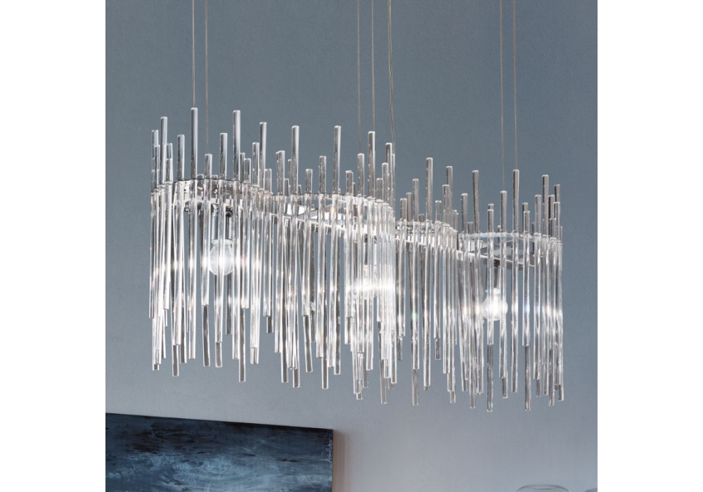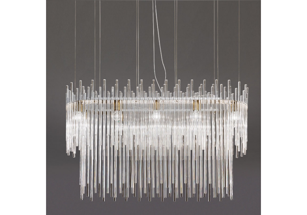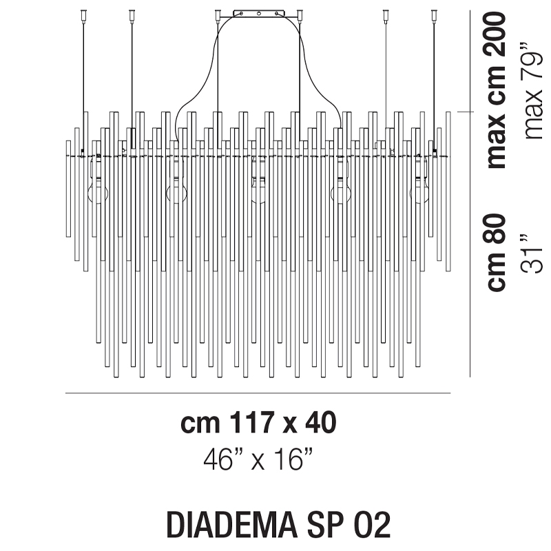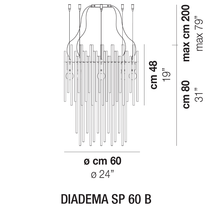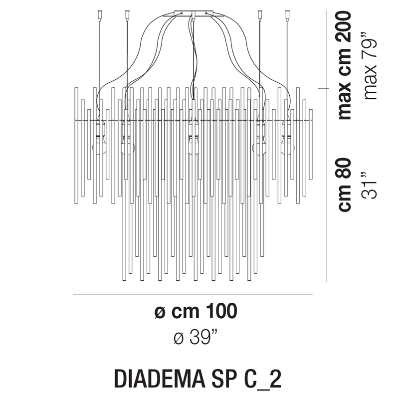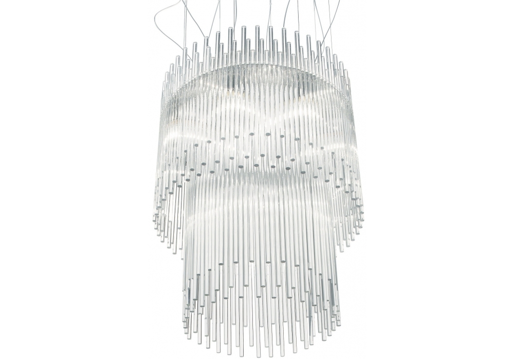 Diadema, von Romani Saccani Architetti Associati für Vistosi entworfen, ist ein Kronleuchter mit tragender Metallstruktur in satinierter Bronze oder glänzendem Chrom. Der Diffusor besteht aus Glas, das durch verschiedene röhrenförmige Applikationen strukturiert ist, und nimmt eine dimmbare Halogen- oder LED-Lichtquelle auf. Diadema ist in verschiedenen Modellen erhältlich.