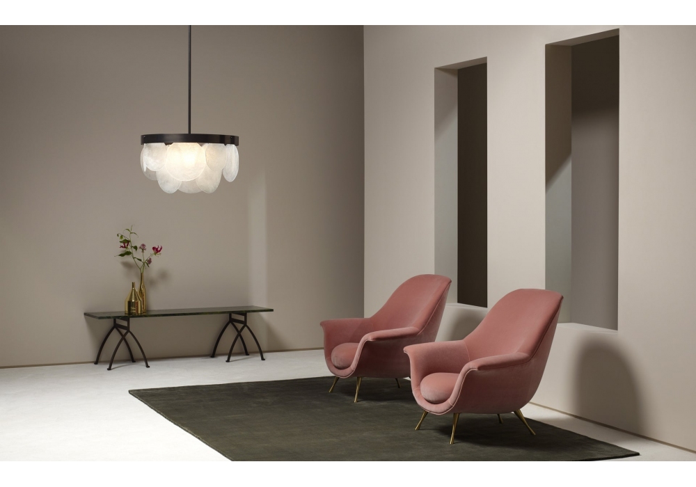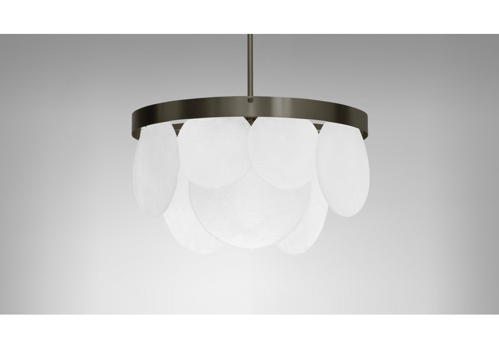 Sasha von CTO Lighting entworfen, ist eine Hängeleuchte mit satinierter Messing- oder Bronzestruktur und halbfertigen handgefertigten Glasscheiben.