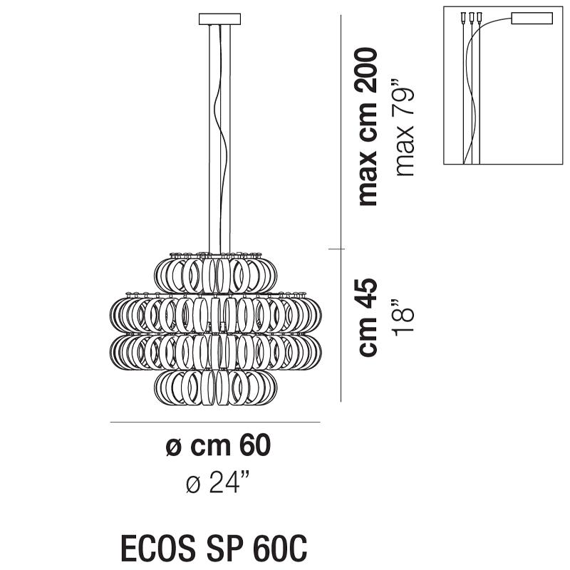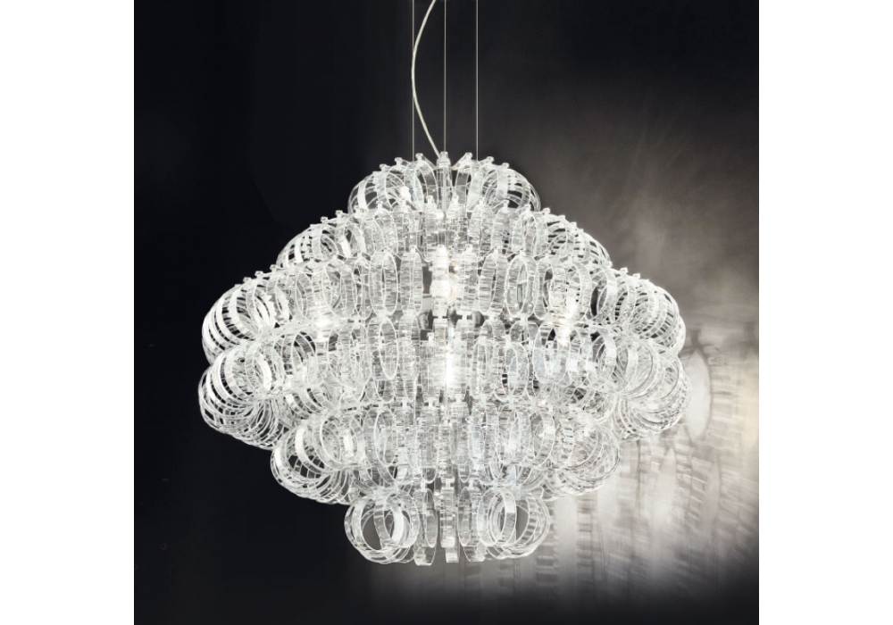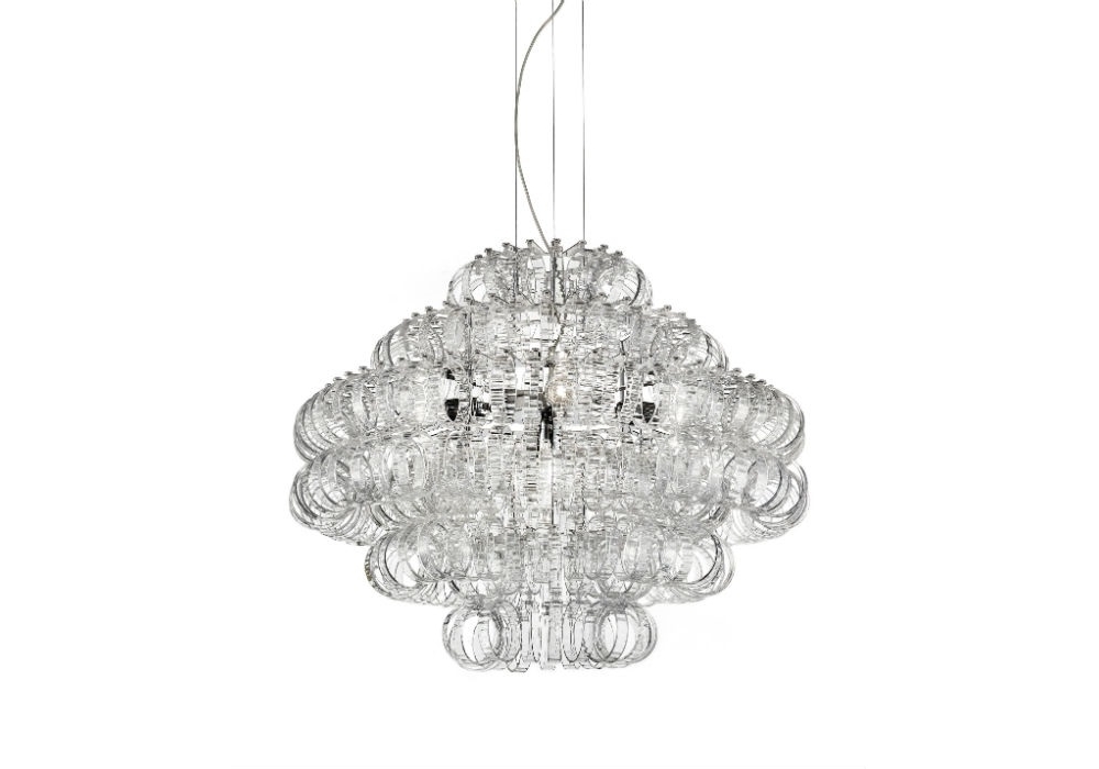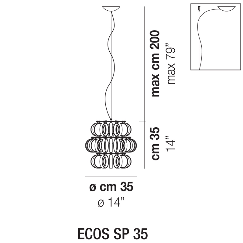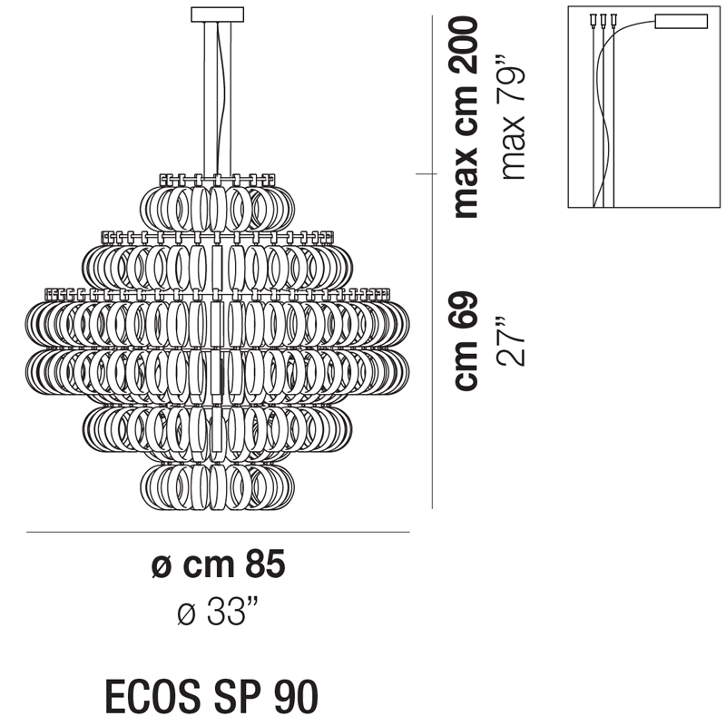 Ecos von Renato Toso, Noti Massari & Associati für Vistosi entworfen ist eine Hängeleuchte mit Metallstruktur in satinierter Bronze oder glänzendem Chrom. Der Diffusor besteht aus rundem Glas und besteht aus verschiedenen Applikationen in Weiß/Rigadin oder Kristall/Rigadin und verwendet eine dimmbare LED- oder Halogenlichtquelle mit E27-Fassung. Ecos ist in verschiedenen Modellen erhältlich.