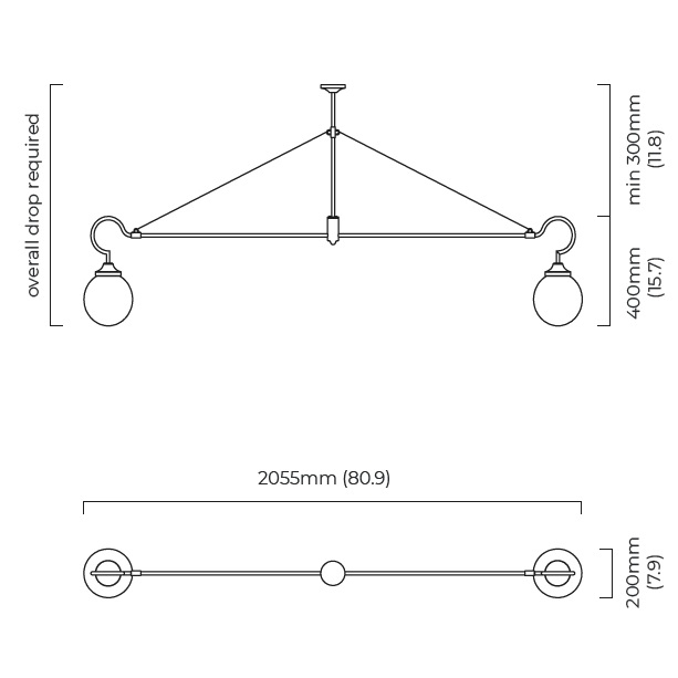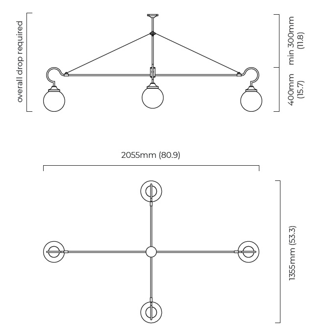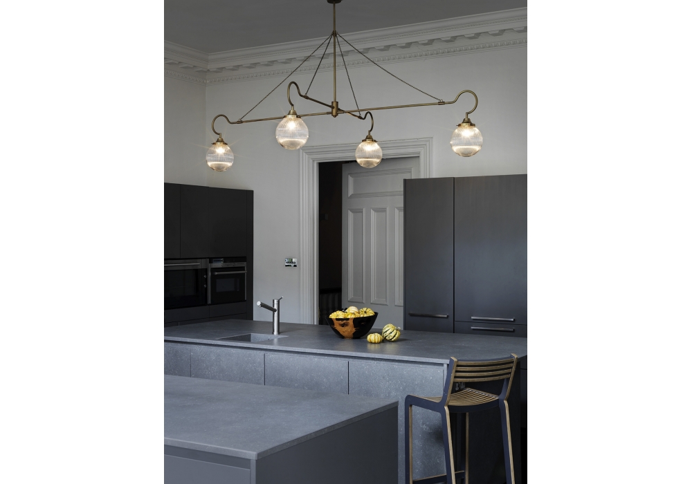 Floren Arm von CTO Lighting entworfen, ist eine Hängeleuchte mit einer antiken Messingstruktur und gestreiften Glasdiffusoren. Verfügbar in 2 Modellen.