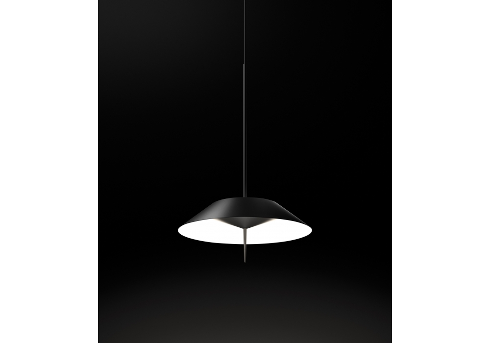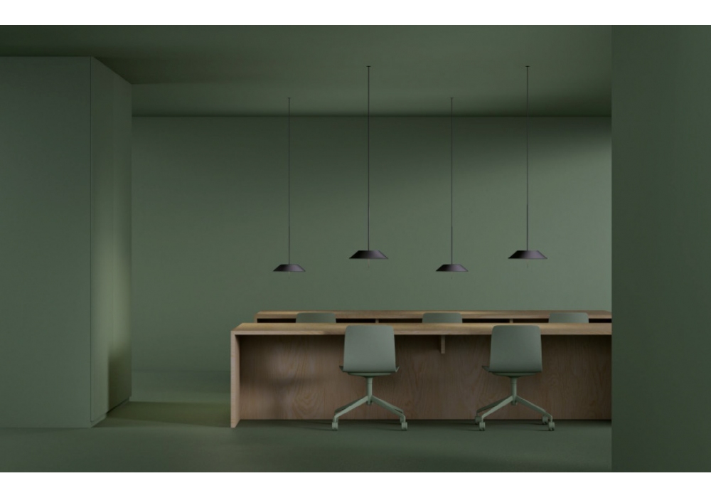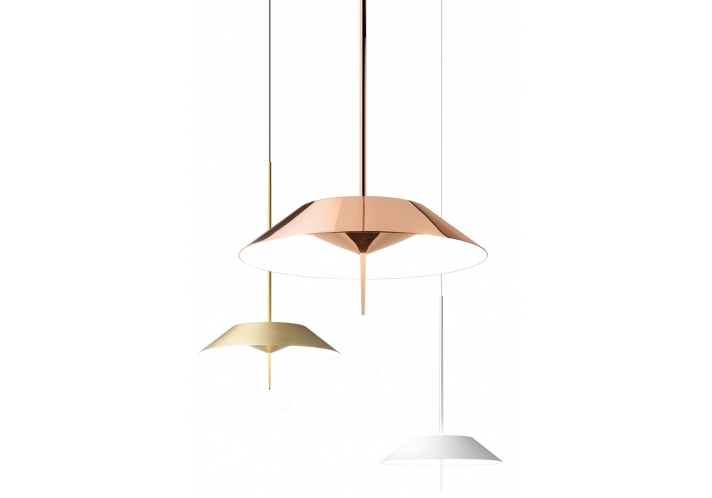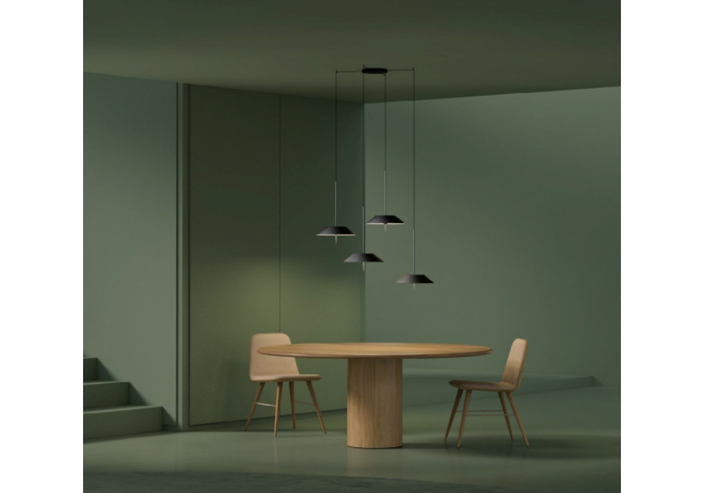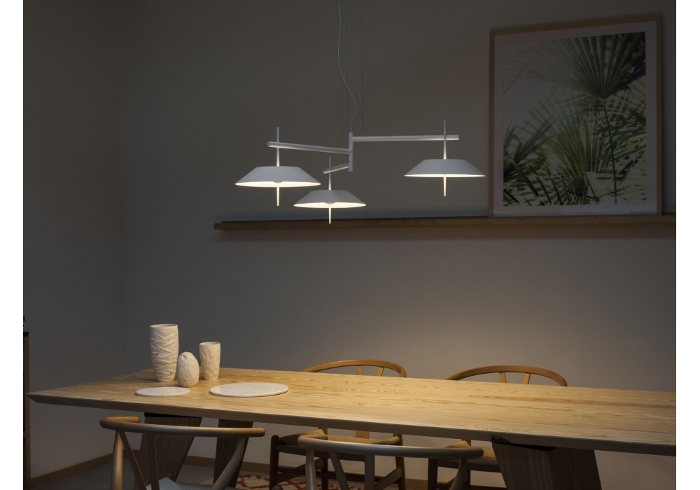 Mayfair von Diego Fortunato für Vibia entworfen ist eine runde Hängeleuchte mit Rosette und vertikalem Stab aus lackiertem Stahl. Der Diffusor besteht aus Polycarbonat und schirmt eine LED-Lichtquelle mit verschiedenen Dimmbarkeitsvarianten ab. Mayfair ist in verschiedenen Ausführungen und Konfigurationen mit mehreren Diffusoren mit eingelassenen oder freiliegenden Rosetten erhältlich, je nach Art der Decke, ob Gipskarton oder Mauerwerk.