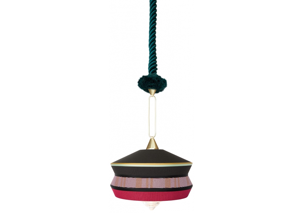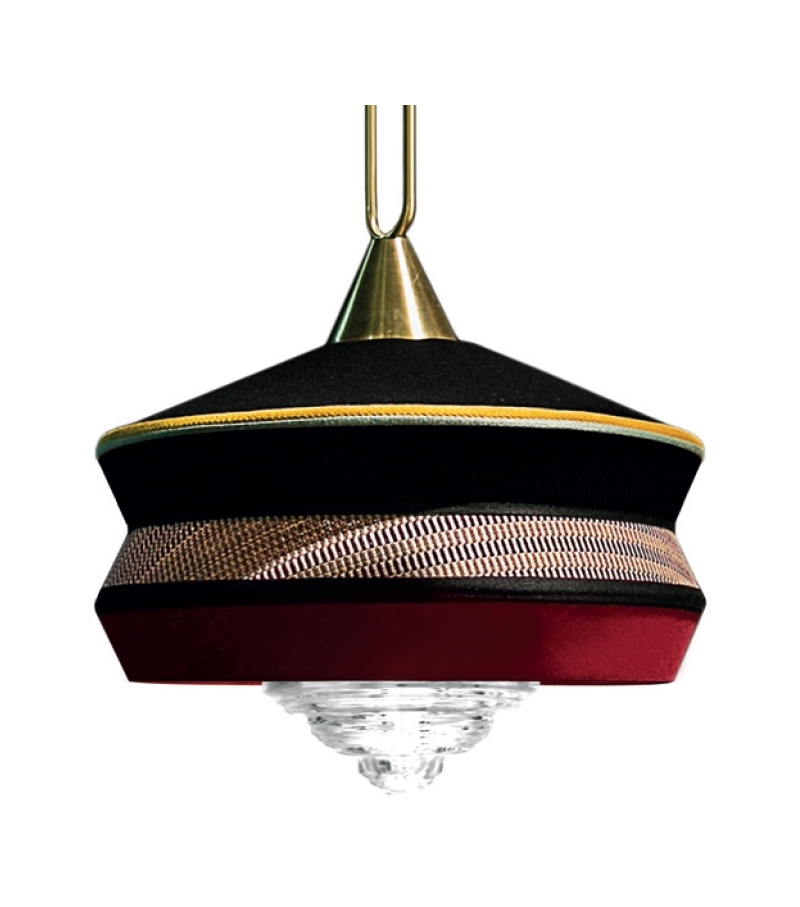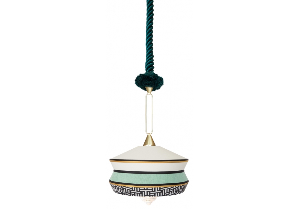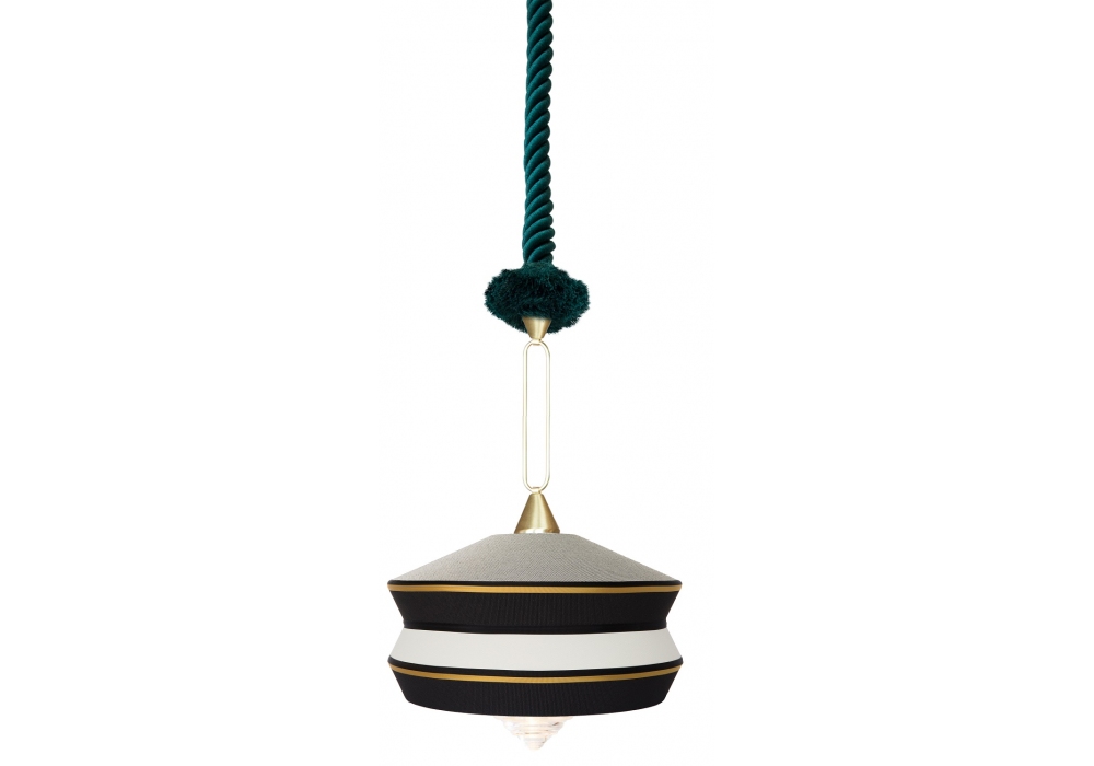 Calypso Antigua von Servomuto für Contardi entworfen ist eine Hängeleuchte mit Tragstruktur aus satiniertem Messing und Hängekabel aus moosgrüner Seide. Der Lampenschirm besteht aus Stoff und verfügt über einen transparenten Glasdiffusor. Die verwendete Lichtquelle ist eine E27-LED-Fassung. Calypso Antigua ist in verschiedenen Ausführungen erhältlich.