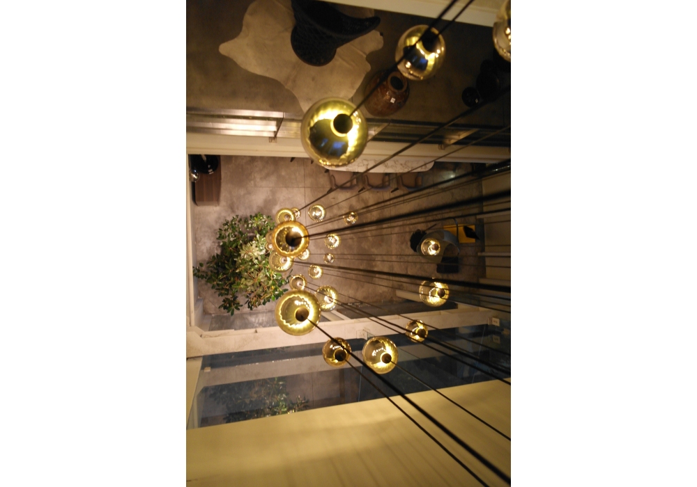 Kubric von Massimiliano Raggi für Contardi entworfen ist eine Hängeleuchte mit Struktur aus satiniertem Goldnickel und Aufhängekabel aus sandfarbenem Stoff. Der Diffusor ist kugelförmig aus mundgeblasenem Glas mit goldfarbener Innenseite und schützt eine LED-Lichtquelle mit einem Triac-Dimmsystem.