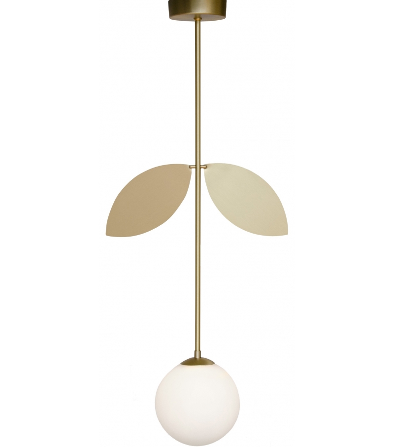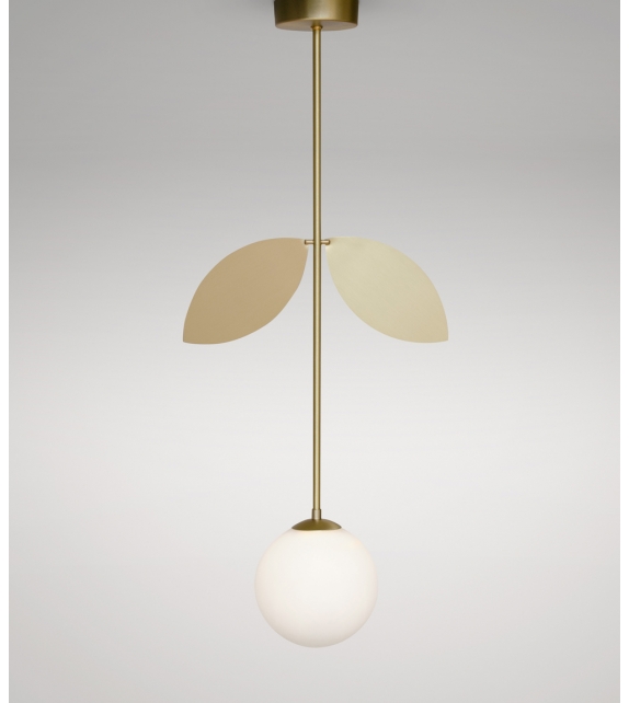 Plant von Atelier Areti entworfen, ist eine Pendelleuchte, die sich durch eine Struktur aus pulverbeschichtetem Metall oder aus satiniertem Messing auszeichnet, an der ein kugelförmiger Lampenschirm aus Glas befestigt ist.