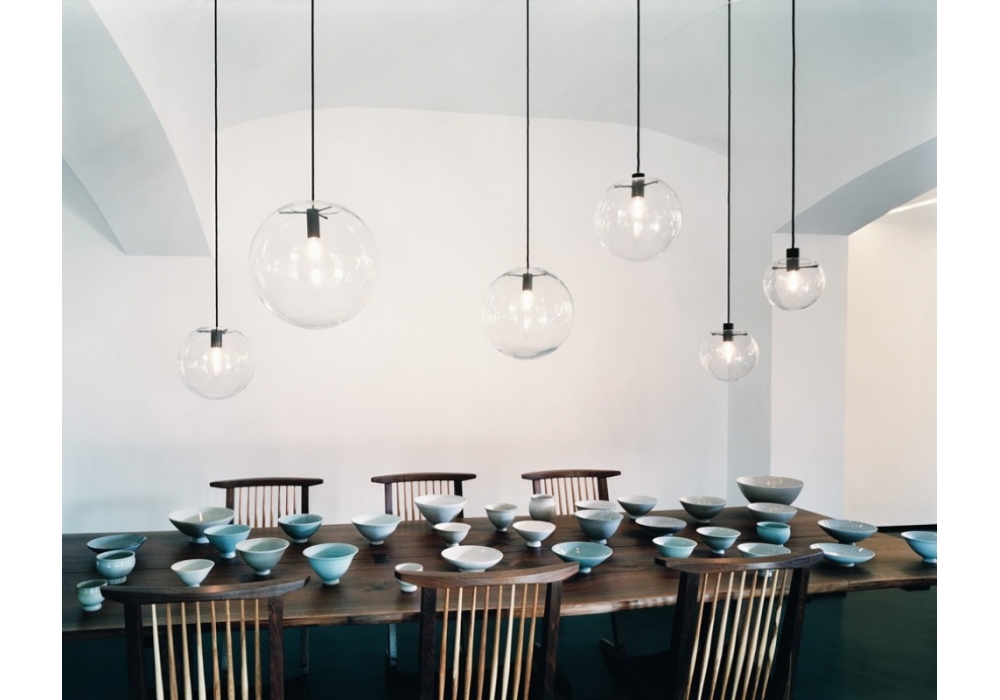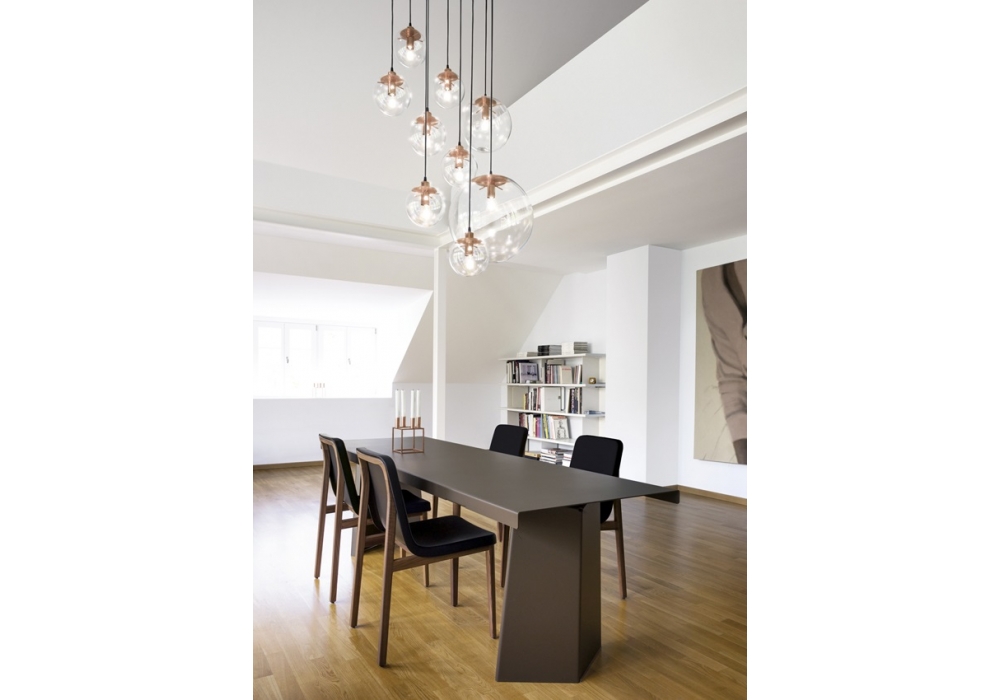 Selene von Sandra Lindner für ClassiCon entworfen, ist eine schöne Hängeleuchte mit Mundgeblasene Kristallklarglaskugel. Zentrisch aufgehängt durch einen fünfarmigen Leuchtenkopf. Insektenschutz-Abdeckscheibe und Leuchtenkopf aus Metall, schwarz lackiert oder vermessingt oder verkupfert. Schwarzes Kabel, stoffummantelt.