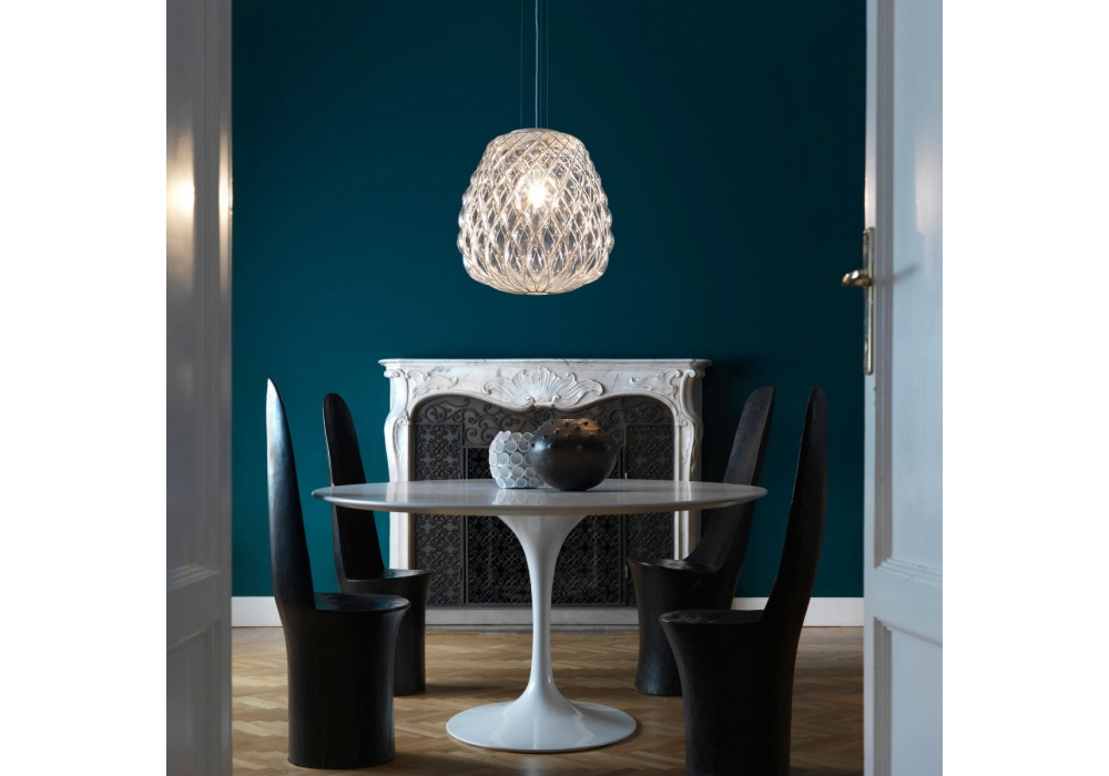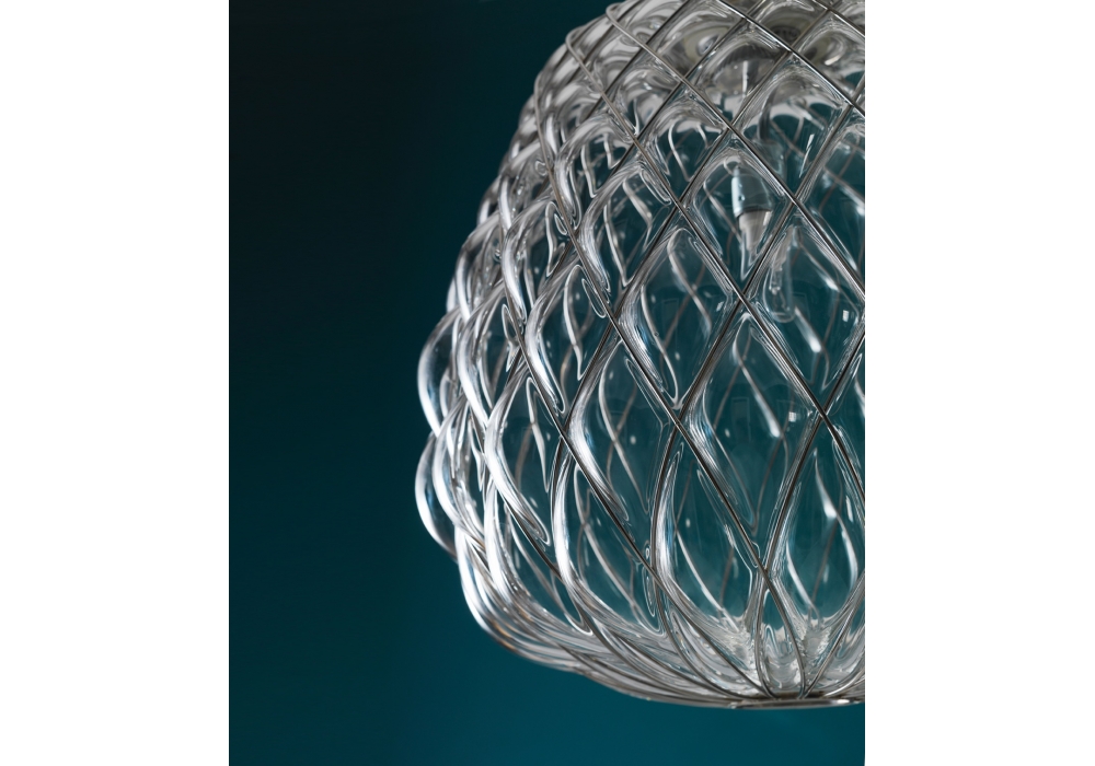 Pinecone von Paola Navone für Fontana Arte entworfen, ist eine Pendelleuchte mit Diffusor aus geblasenem Glas transparent oder milchweiß geätzt. Verchromt oder vergoldet Metallkorb. Zuleitung transparent. Abhängung aus Stahlseil. Auch verfügbar in 3 verschiedenen Modells.
