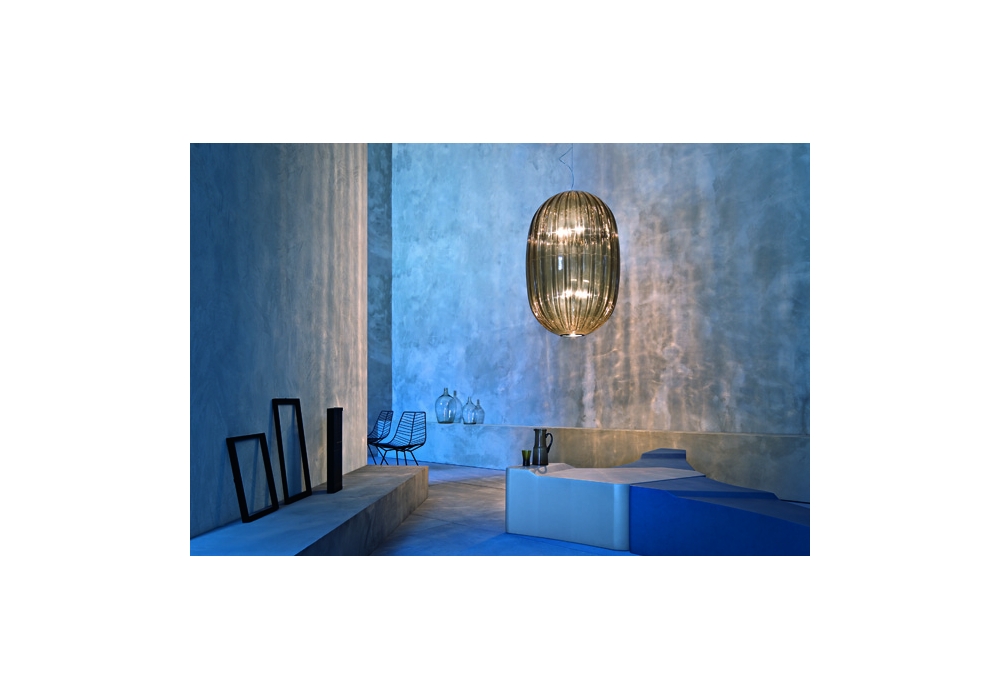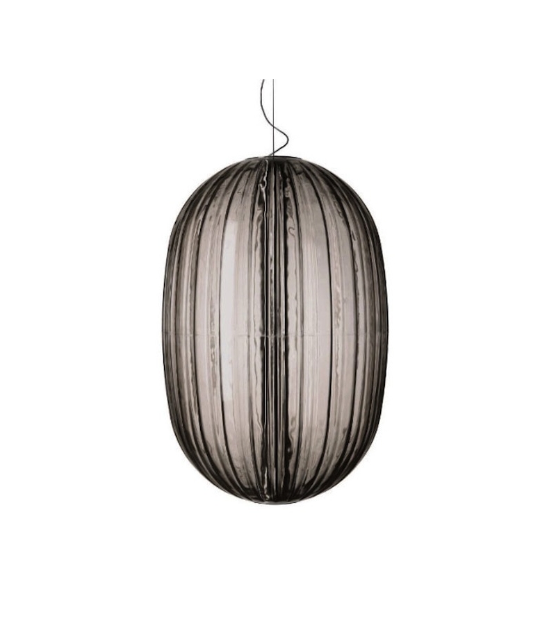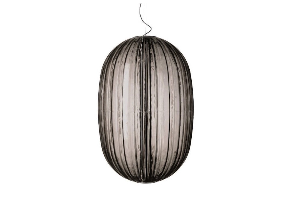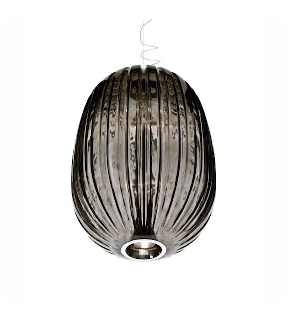 Plass von Luca Nichetto für Foscarini entworfen, ist eine Hängeleuchte mit tragender Struktur aus Aluminium und Lampenkörper aus transparentem grauem Polycarbonat. Die verwendete Lichtquelle ist vom LED- oder Halogentyp.