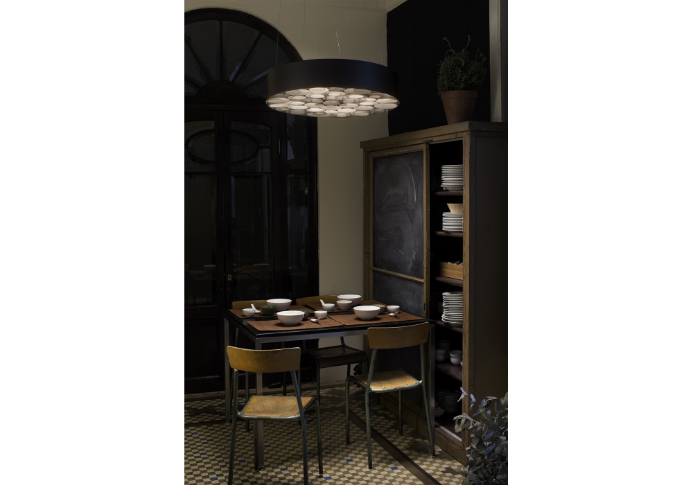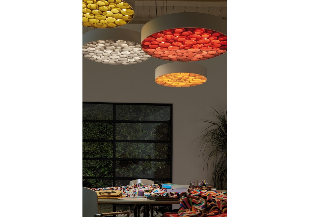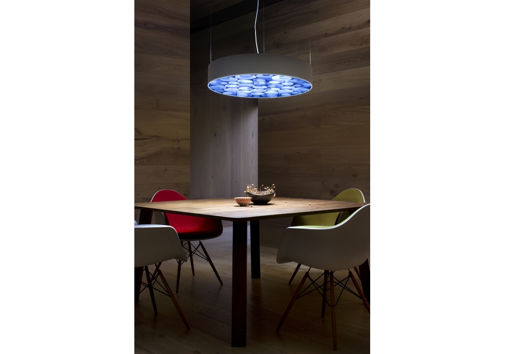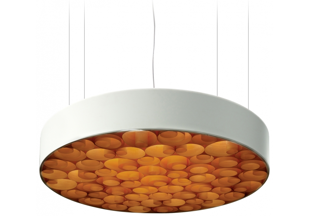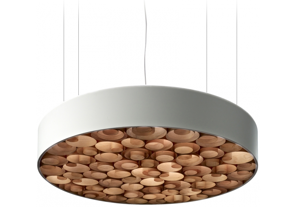 Spiro von Remedios Simón für LZF entworfen, ist ein Hängeleuchte mit Schale aus Acryl und Spiralen in Holzfurnier. Verfügbar in mehreren Ausführung.