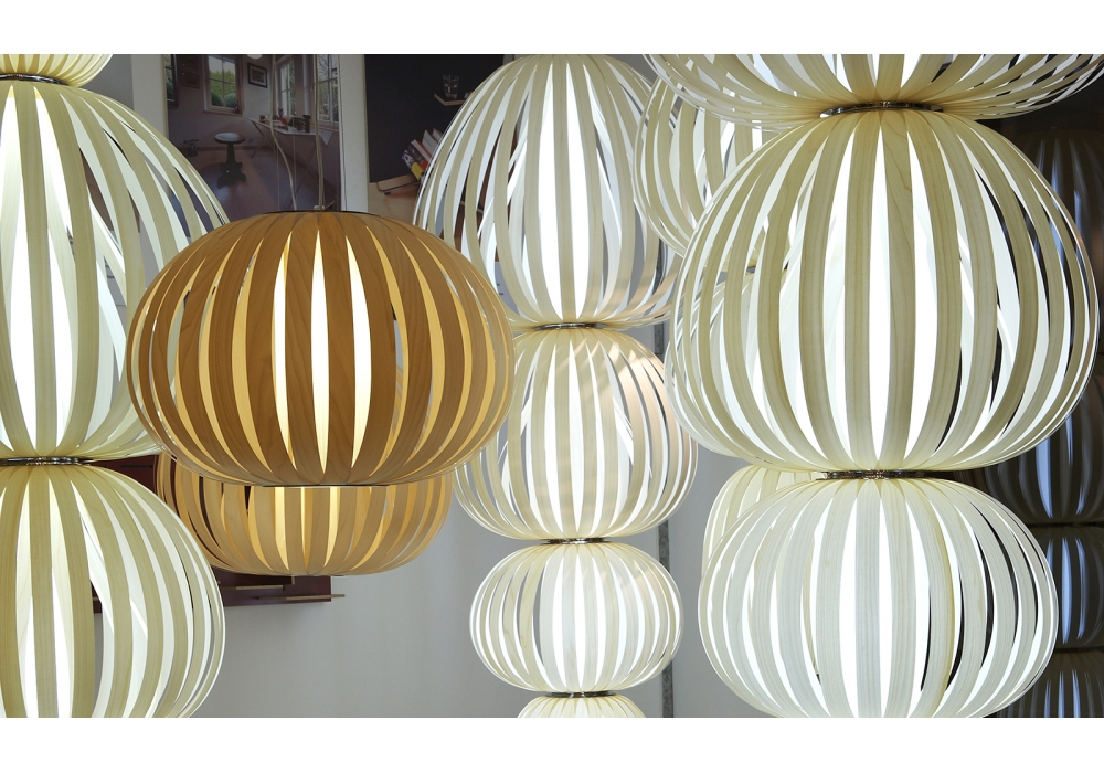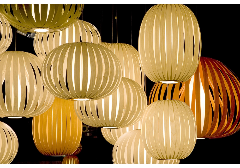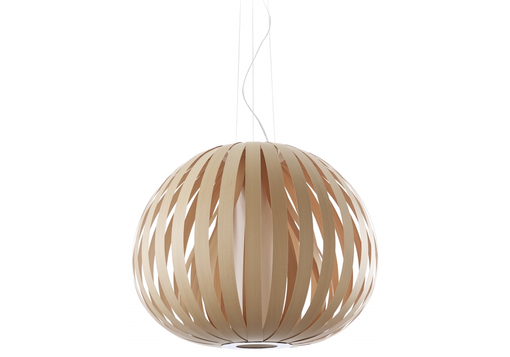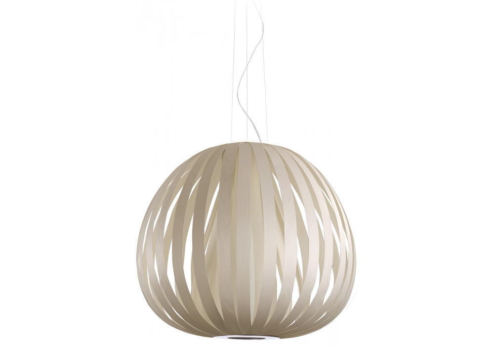 Poppy von Burkhard Dämmer für LZF entworfen, ist ein Hängeleuchte aus Holzfurnier mit Deckenrosette in gebürstetem Nickel. Verfügbar in mehreren Ausführung und Größen