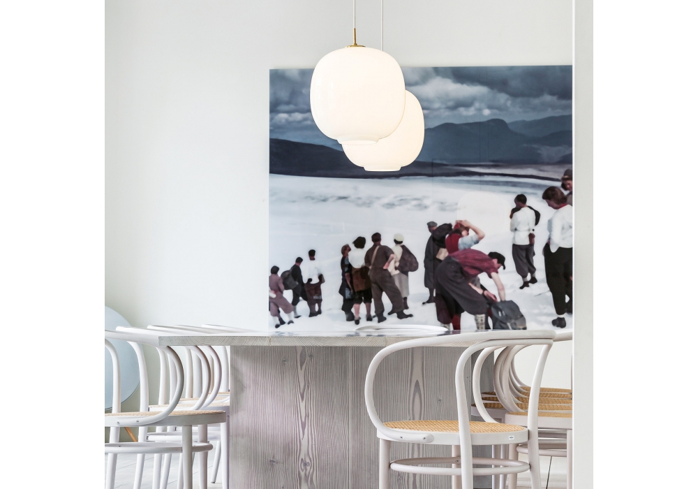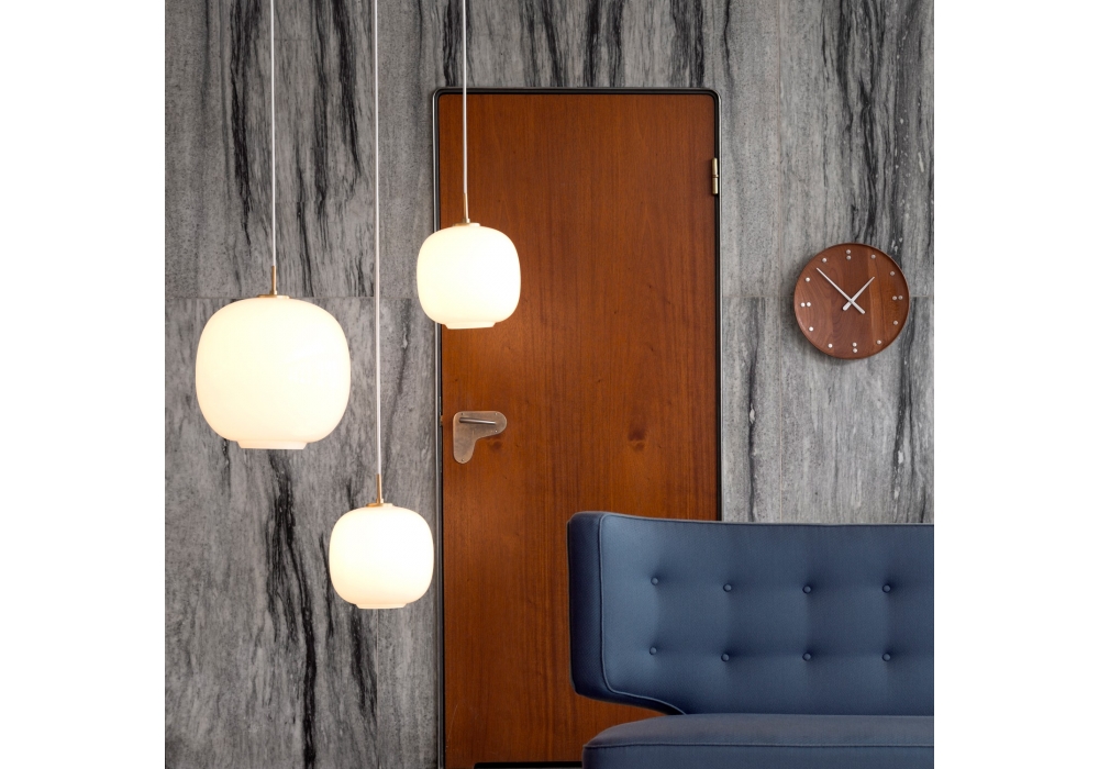 VL45 Radiohus, von Vilhelm Lauritzen für Louis Poulsen entworfen, ist eine abgerundete Hängeleuchte mit tragender Struktur aus gebürstetem Messing. Der Diffusor besteht aus mundgeblasenem Opalglas in glänzendem Weiß und schirmt eine LED- oder Halogenlichtquelle in verschiedenen dimmbaren Versionen ab. VL45 Radiohus ist in verschiedenen Größen erhältlich.