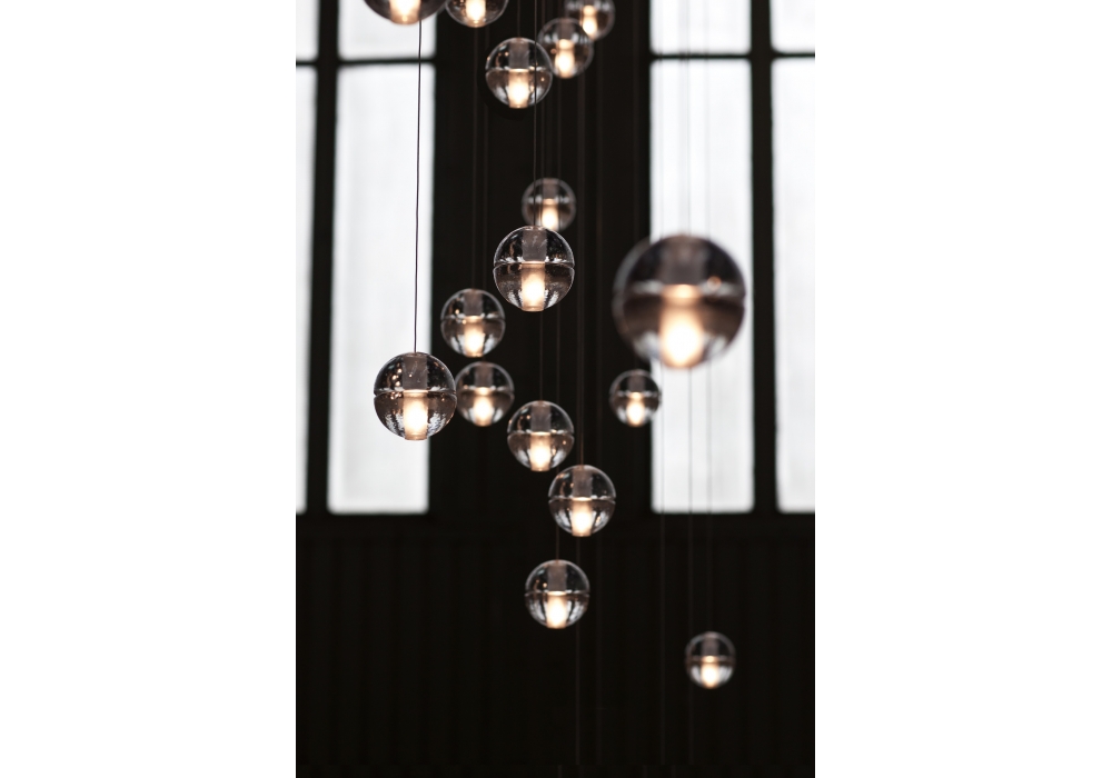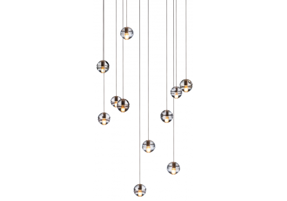 14.11 von Omer Arbel für Bocci entworfen, ist eine Pendelleuchte mit elf Glaskugeln, erhältlich in zwei Konfigurationen. Jede Kugel besteht aus mundgeblasenem Borosilikatglas. Im Inneren befindet sich ein Hohlraum, in dem eine Niederspannungs-LED oder Xenon-Lampe untergebracht ist. Erhältlich in drei Versionen; Rectangle, Square und Round sowie vier verschiedene Diffusoren: transparent, grau oder bernsteinfarben.