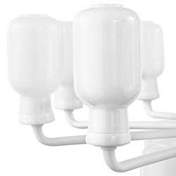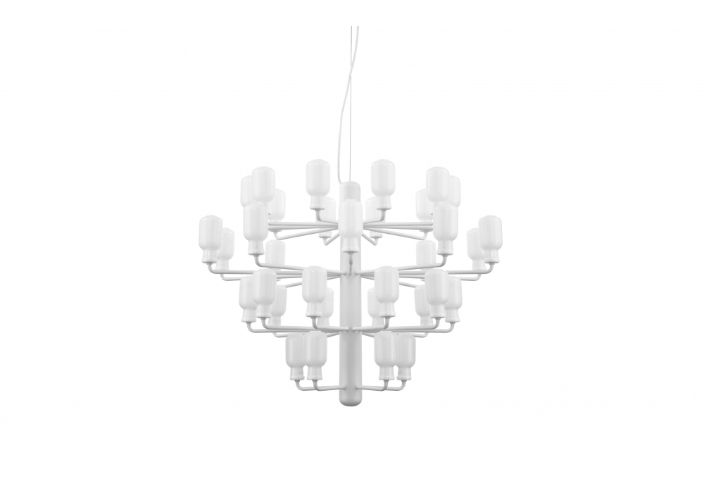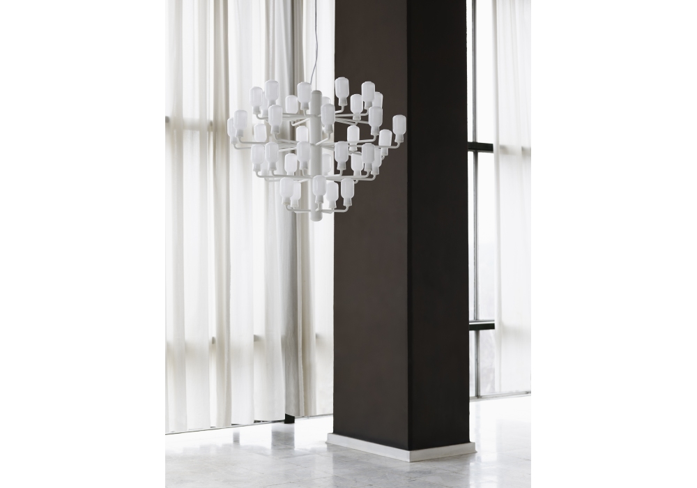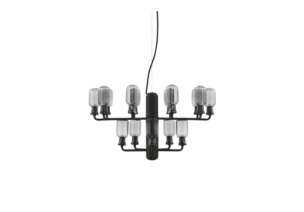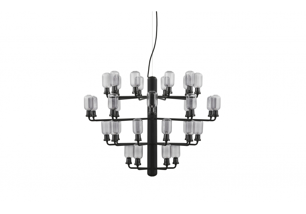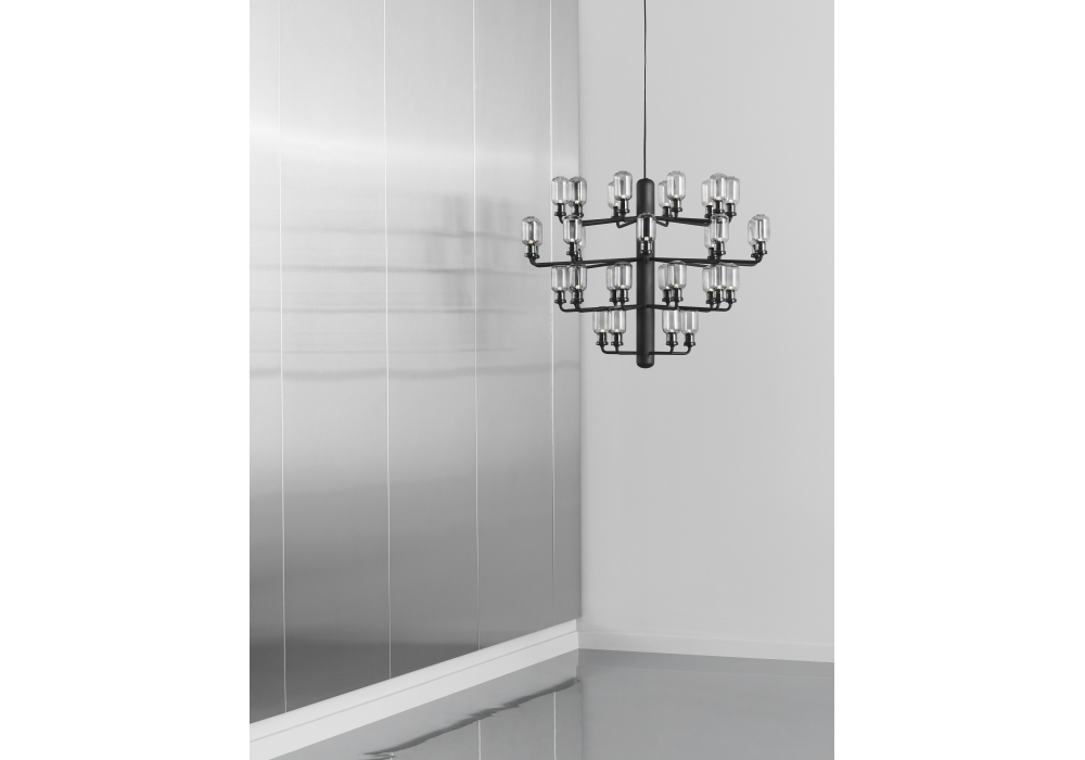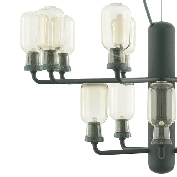Amp, entworfen von Simon Legald für Normann Copenhagen, ist eine Hängeleuchte aus Metall, Marmor und Glas. Amp Chandelier besteht aus einer raffinierten Kombination aus Marmor und hellem Glas und besteht aus einem zentralen Stahlzylinder, von dem kurze Arme abzweigen, wobei auf jedem Arm ein zylindrischer Glasdiffusor steht, auf dem sich eine LED-Lichtquelle befindet (nicht im Lieferumfang enthalten). Amp ist in drei verschiedenen Ausführungen und zwei Größen erhältlich.