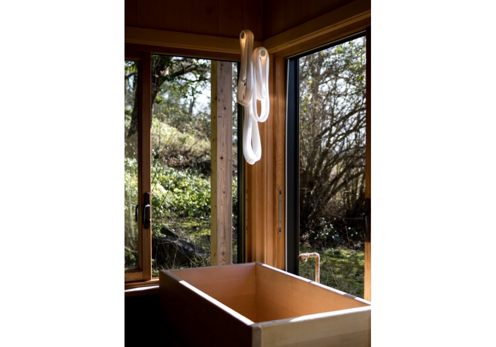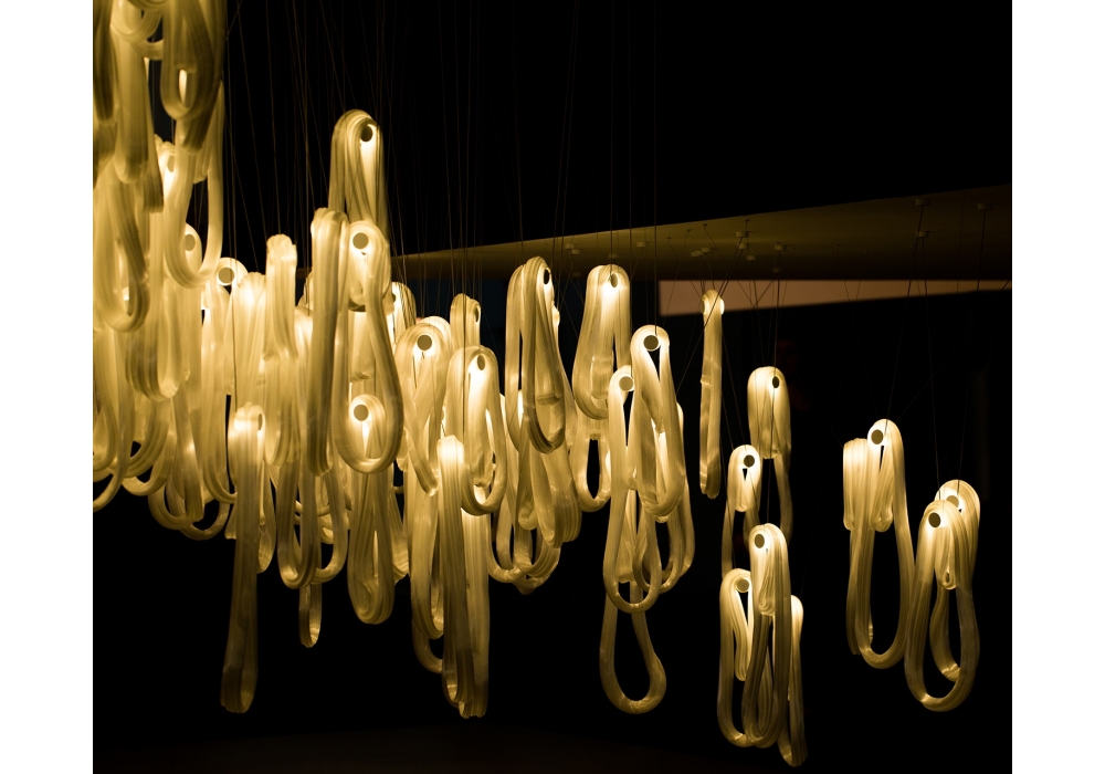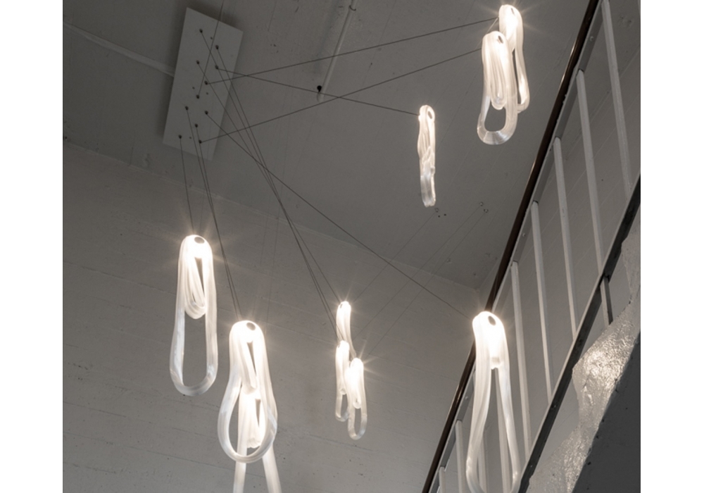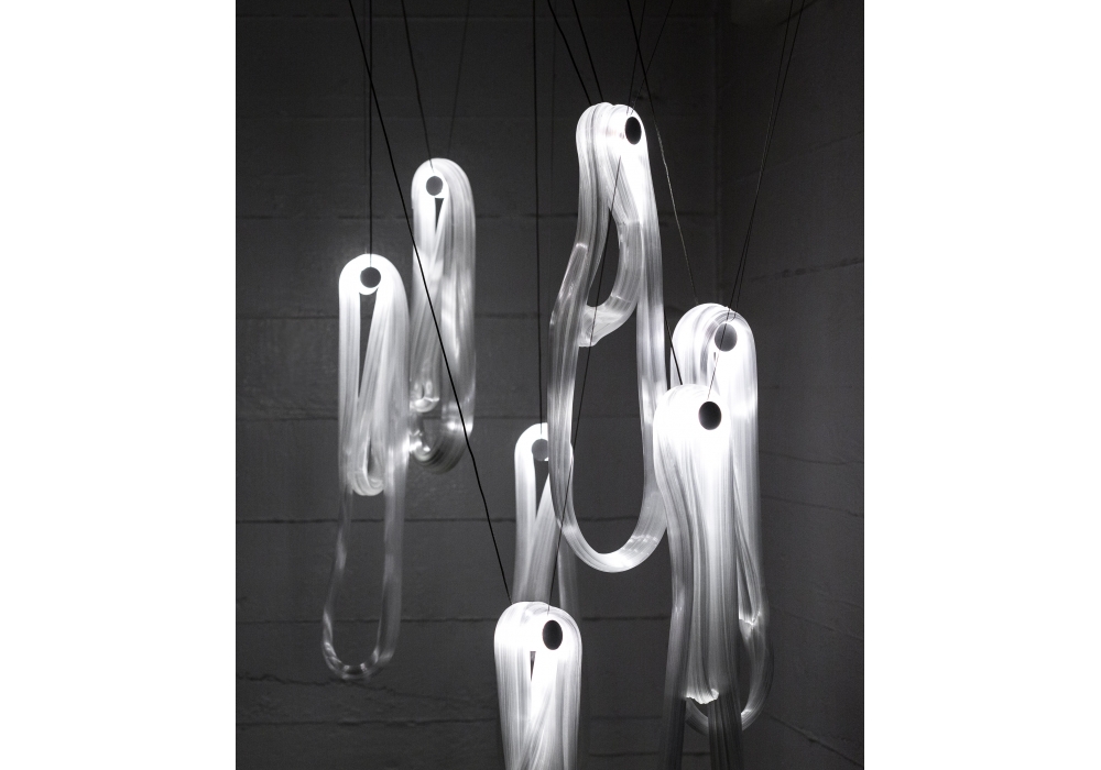 Die Serie 87 von Omer Arbel für Bocci entworfen, ist eine Pendelleuchte, die in verschiedenen Konfigurationen erhältlich ist. Die innovative Verarbeitungstechnik beinhaltet die Verwendung von kohlensäurehaltigem Wasser, um Luft in der überhitzten Glasmatrix einzuschließen, die anschließend vertikal gestreckt und wiederholt um sich selbst gewickelt wird. Nach dem Abkühlen verwandelt die Biegebewegung die eingeschlossene Luft in Mikrofilamente, die dem Stück einen perlmuttartigen Effekt verleihen. Erhältlich in verschiedenen Ausführungen.