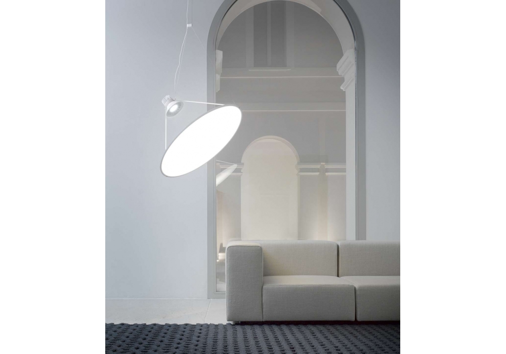 Amisol von Daniel Rybakken für Luceplan entworfen, ist eine im Raum verstellbare Hängeleuchte. Die Struktur besteht aus weißem Aluminium und ist mit einer Kunststoffscheibe von Ø 75 cm oder Ø 110 cm ausgestattet, die in drei Ausführungen erhältlich ist. Es ist möglich, das Anti-Rotations-Zubehör hinzuzufügen.