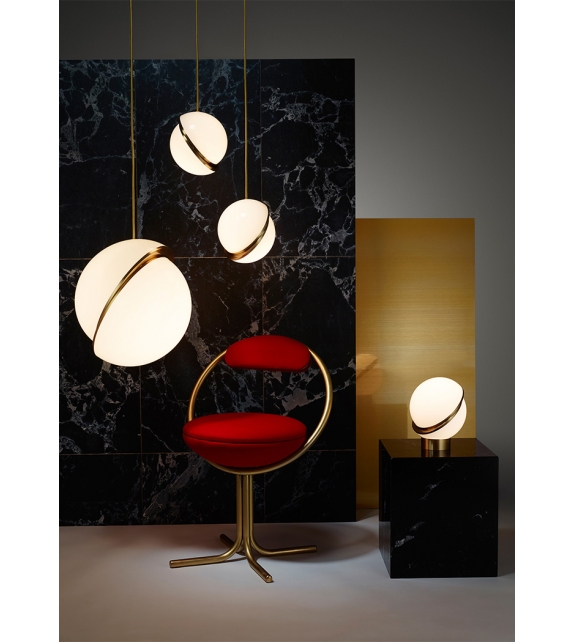 Mini Crescent Light, von Lee Broom entworfen, ist eine Hängeleuchte aus opakem Acryl und gebürstetem Messing. Mit einer beleuchteten Kugel, die in der Hälfte geschnitten ist, um eine halbmondförmige Messing-Faszie zu enthüllen, verbindet Mini Crescent Light ist eine Miniaturversion des beliebten Crescent Light, dass festen und den undurchsichtigen. Goldgewebekabel von 300 cm. Gebürstetem Messing Rosette 12 cm rund.