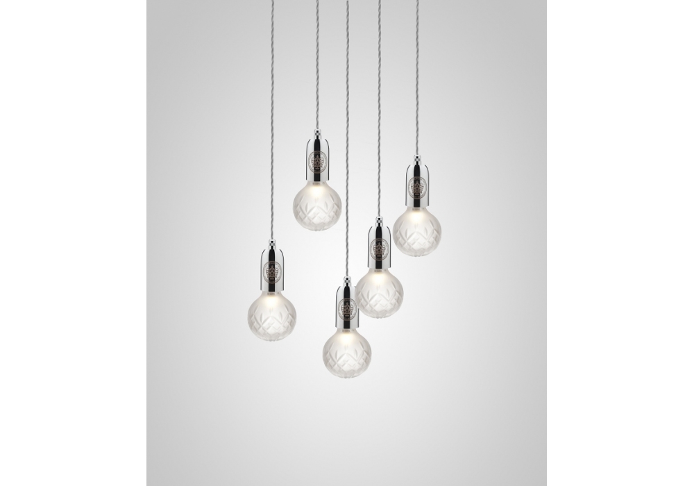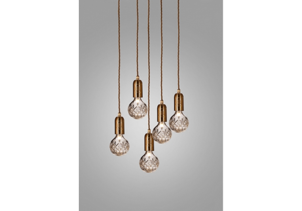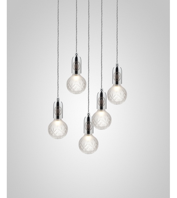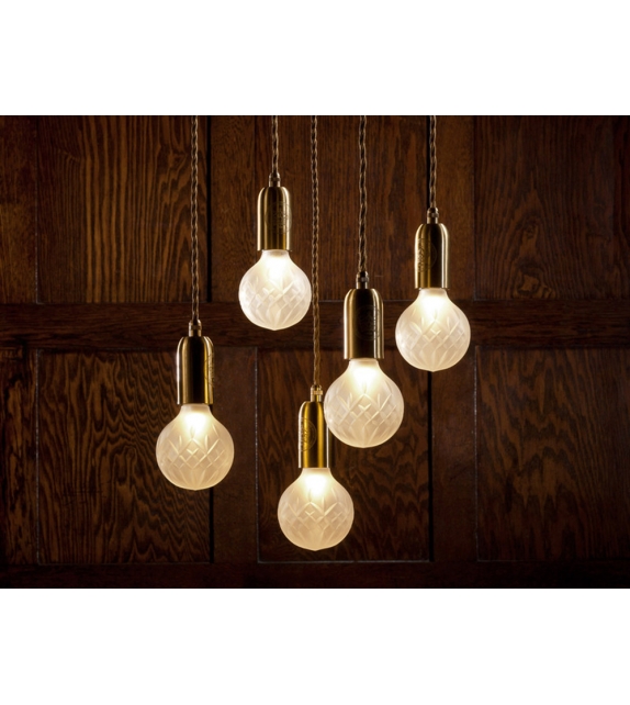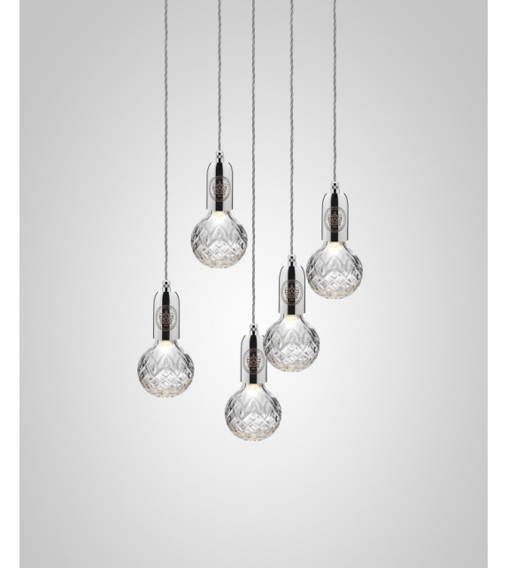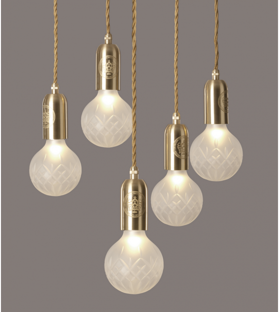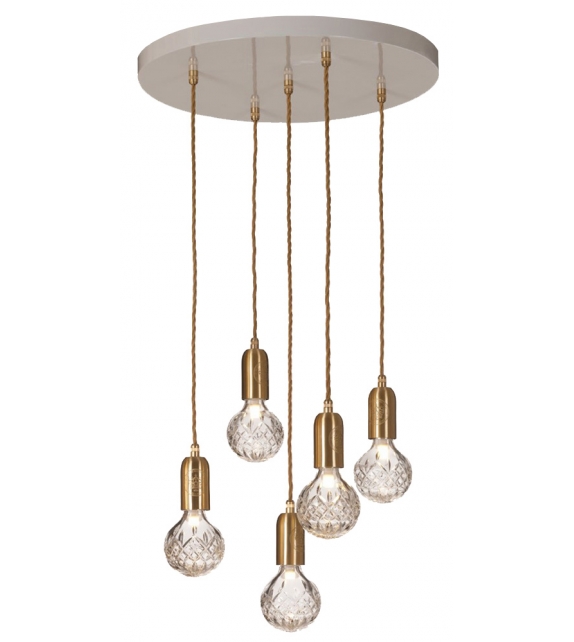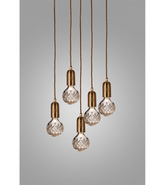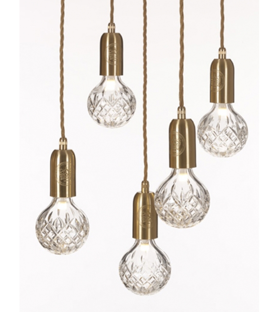 Crystal Bulb, entworfen von Lee Broom, ist eine Hängeleuchte mit 5 Bleikristall-Anhängern in gebürstetem Messing oder geschnitzten polierten Chromoberflächen, die mit dem Lee Broom-Logo eingraviert sind, das ein sauberes und einfaches Profil erzeugt. Crystal Bulb kombiniert industrielle Einflüsse mit dekorativen Qualitäten und verwandelt die alltägliche Glühbirne in einen dekorativen Rahmen. Es wird mit traditionellen Techniken handgefertigt. Enthält 5 goldene Stoffkabel von 300 cm und eine Messingrosette mit einem Durchmesser von 45 cm. Erhältlich in 2 Modellen.
