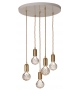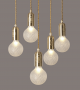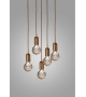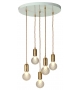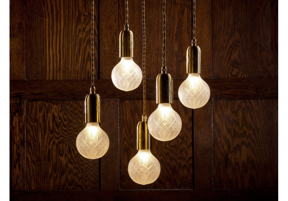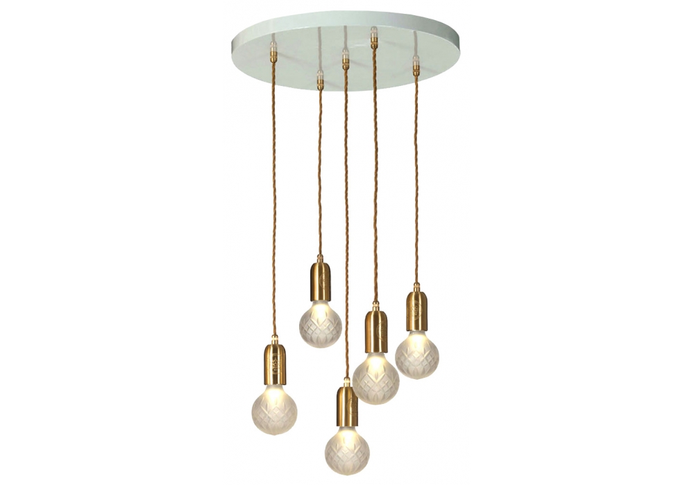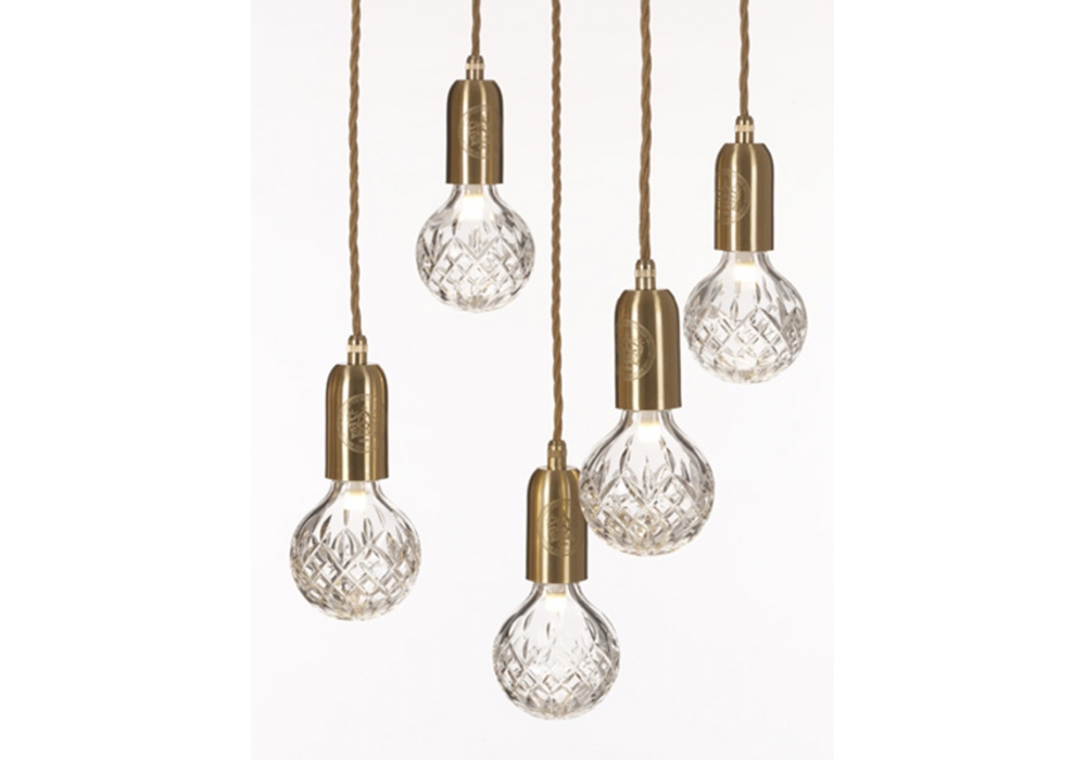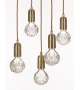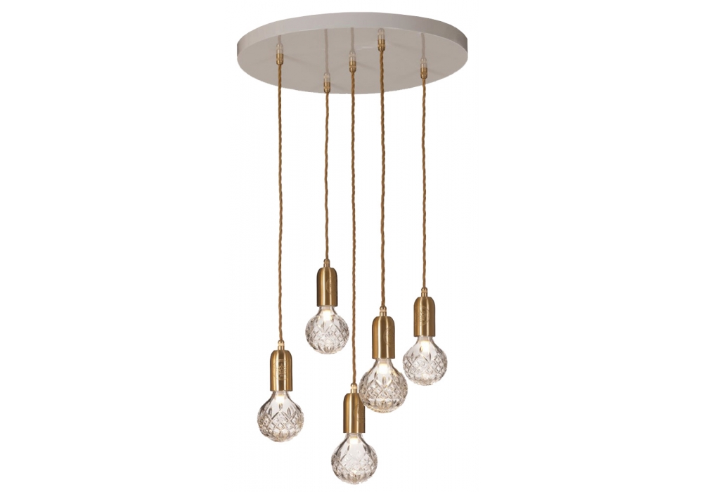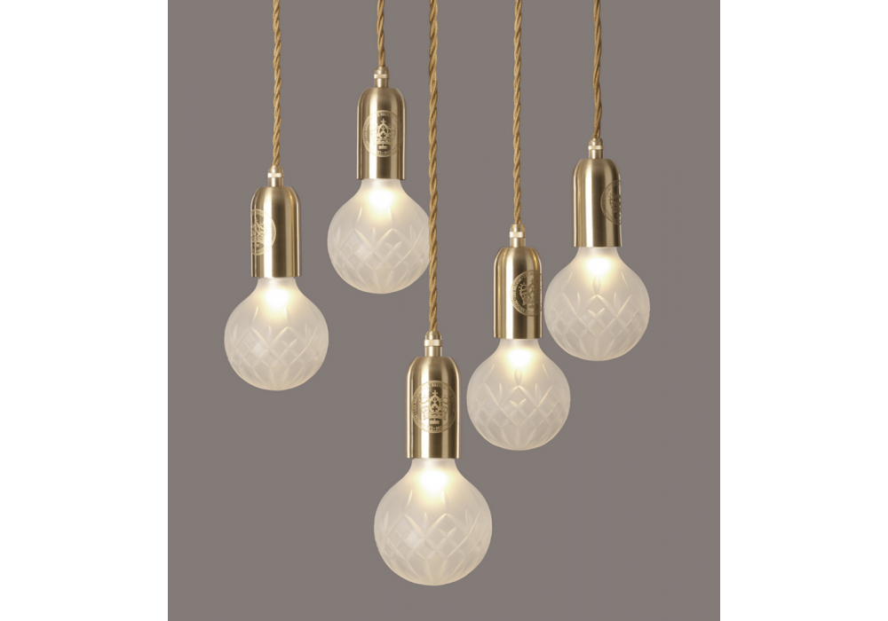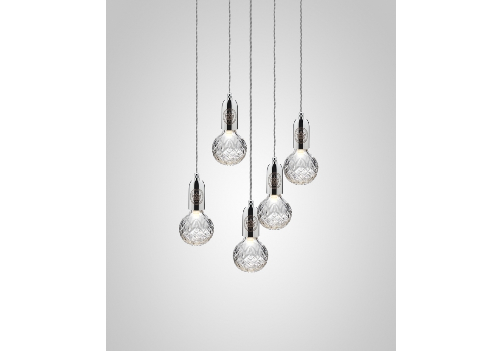 Crystal Bulb, entworfen von Lee Broom, ist eine Hängeleuchte mit 5 Bleikristall-Anhängern in gebürstetem Messing oder geschnitzten polierten Chromoberflächen, die mit dem Lee Broom-Logo eingraviert sind, das ein sauberes und einfaches Profil erzeugt. Crystal Bulb kombiniert industrielle Einflüsse mit dekorativen Qualitäten und verwandelt die alltägliche Glühbirne in einen dekorativen Rahmen. Es wird mit traditionellen Techniken handgefertigt. Enthält 5 goldene Stoffkabel von 300 cm und eine Messingrosette mit einem Durchmesser von 45 cm. Erhältlich in 2 Modellen.