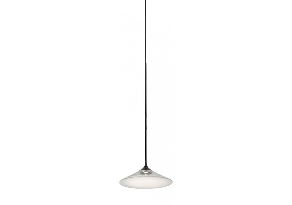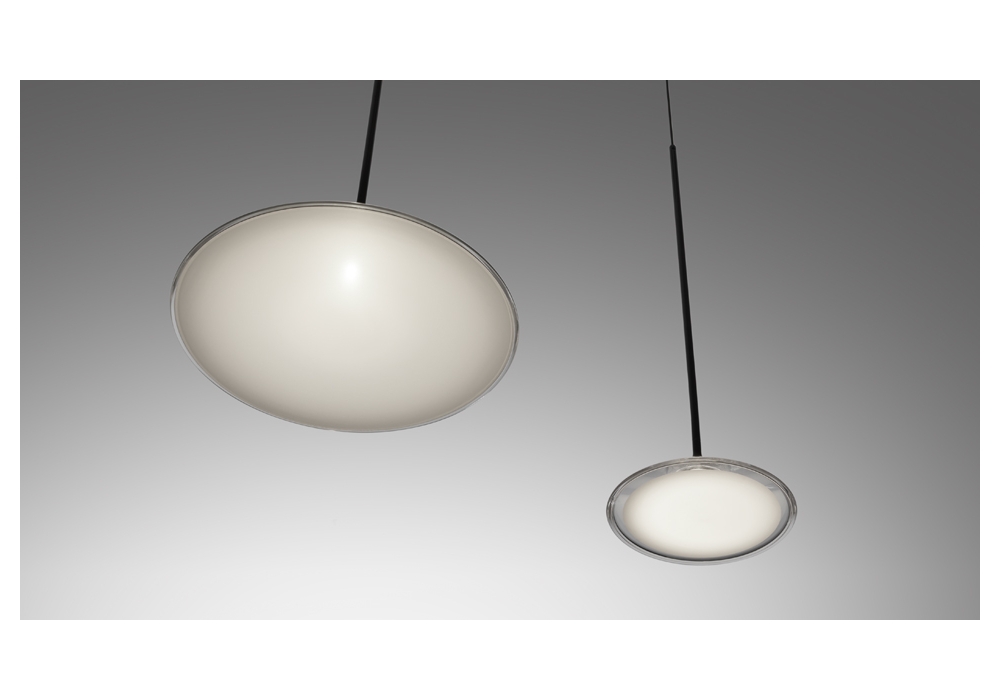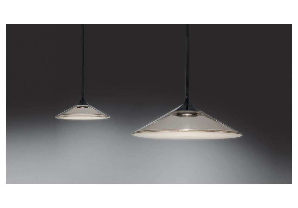 Orsa von Foster + Partners für Artemide entworfen ist eine Hängeleuchte mit einer Struktur aus Methacrylat, Aluminium und schwarz lackiertem Stahl. Der Diffusor besteht aus hochbeständigem Kunststoff mit kreisförmiger Form und verfügt über eine dimmbare LED-Lichtquelle. Orsa ist in verschiedenen Größen erhältlich.