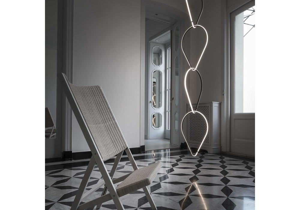 Arrangements Drop von Michael Anastassiades für Flos entworfen, ist eine Hängeleuchte mit diffusem Licht. Sie besteht aus einem gebogenen, schwarz lackierten Aluminiumgehäuse und einem platinfarbenen Diffusor aus optischem Silikon. Dank eines elektrischen und mechanischen Anschlusssystems ermöglicht sie individuelle Konfigurationen. Erhältlich mit Rosetten unterschiedlicher Leistung und in Ausführungen für die Montage auf Beton oder Gipskarton. Die integrierte Elektronik unterstützt verschiedene Dimmsysteme, sodass der Lichtstrom auch während der Installation reguliert werden kann. LED-Leuchtmittel im Lieferumfang enthalten.