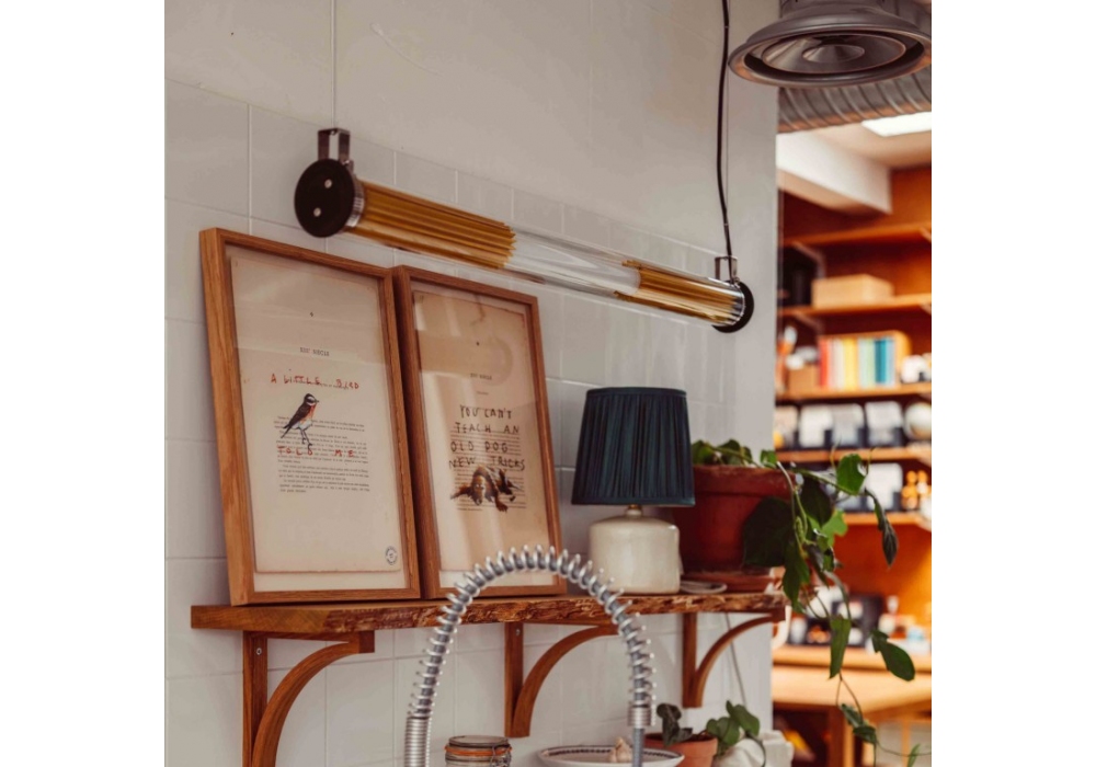 In The Tube 360° von Dominique Perrault & Gaëlle Lauriot-Prévost für DCW Éditions entworfen, ist eine Hängeleuchte aus Borosilikatglas, die mit in Silikon versiegelten Aluminiumstopfen verschlossen ist. Die "In The Tube" Kollektion vereinigt eine grosse Anzahl von Varianten in der Länge, im Durchmesser und mit dem Spiel der Farben.