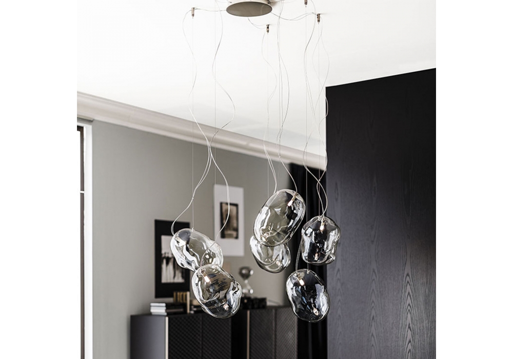 Cloud, von Oriano Favaretto für Cattelan Italia entworfen, ist eine Hängeleuchte mit Glasschirm und Deckenrosette aus Satin Nickel Stahl. Verfügbar in verschiedenen Zusammensetzungen.