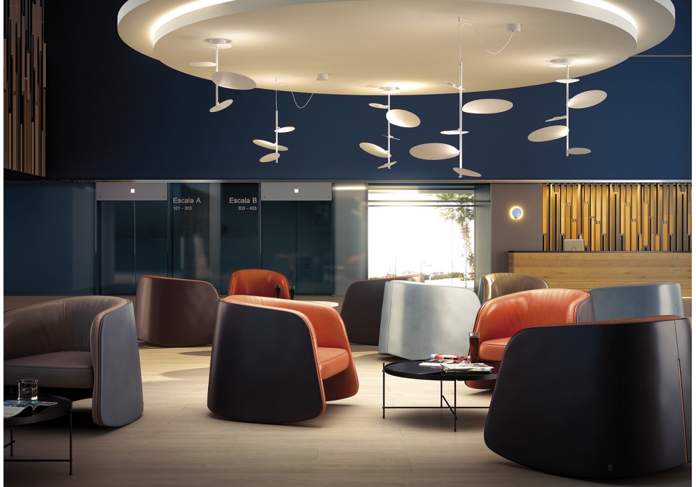 Obs von Estudi Ribaudí für Estiluz entworfen, ist eine Hängeleuchte, die vollständig aus Metall besteht. Die Diffusoren sind um 340° verstellbar und verwenden eine LED-Lichtquelle mit einem Triac-Dimmersystem. Obs ist in verschiedenen Ausführungen erhältlich.