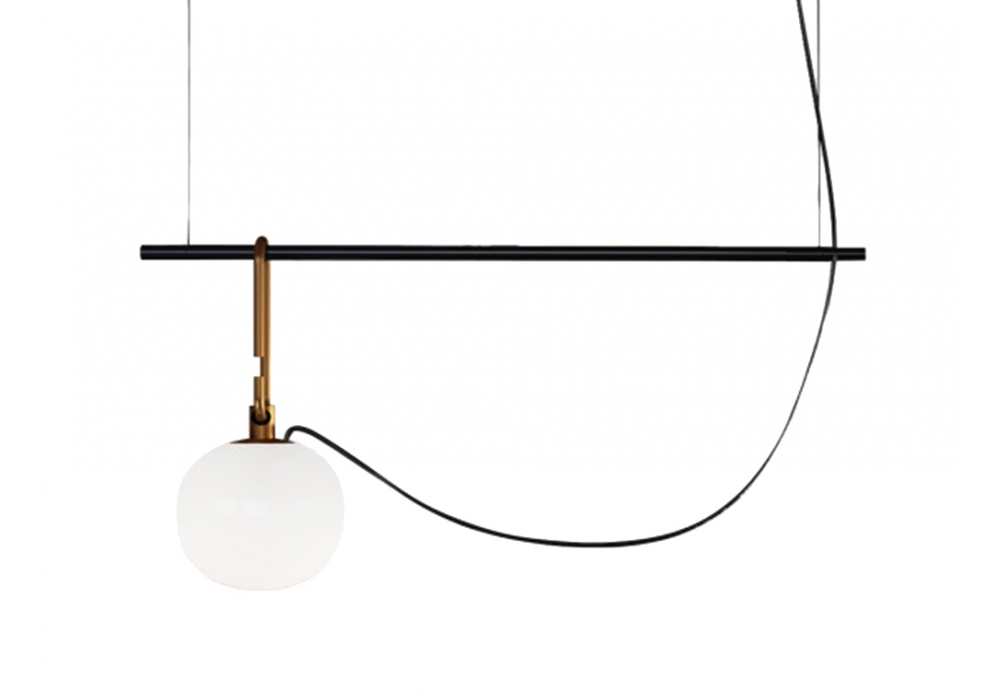 NH S2 14 von Neri & Hu für Artemide entworfen ist eine Hängeleuchte mit gebürstetem Messingring und kugelförmigem Diffusor aus weißem geblasenem Glas. Bei der Lichtquelle handelt es sich um eine dimmbare LED.