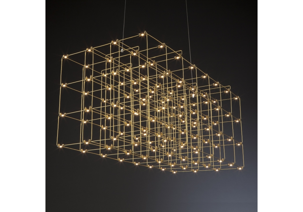 Cosmos Square von Jan Pauwels für Quasar entworfen ist eine Hängeleuchte mit einer schwarzen Rosette und einem viereckigen Leuchtenkörper, der durch eine Reihe aneinander verankerter Rohrstäbe strukturiert ist. Die an der Tragkonstruktion befestigten Lichtquellen sind vom Typ LED. Cosmos ist in verschiedenen Modellen und Ausführungen erhältlich.