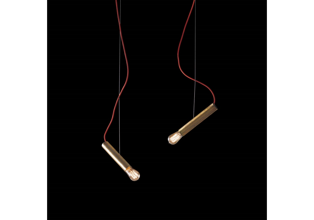 Pipe Light-S von Massimo Castagna für Henge entworfen ist eine Pendelleuchte mit einem zylindrischen Körper aus handpoliertem Messing mit einstellbarer Neigung. Die Lichtquelle besteht aus Wolfram aus geblasenem Glas. Das Aufhängungskabel besteht aus Stahl, der mit roter Seide überzogen ist.