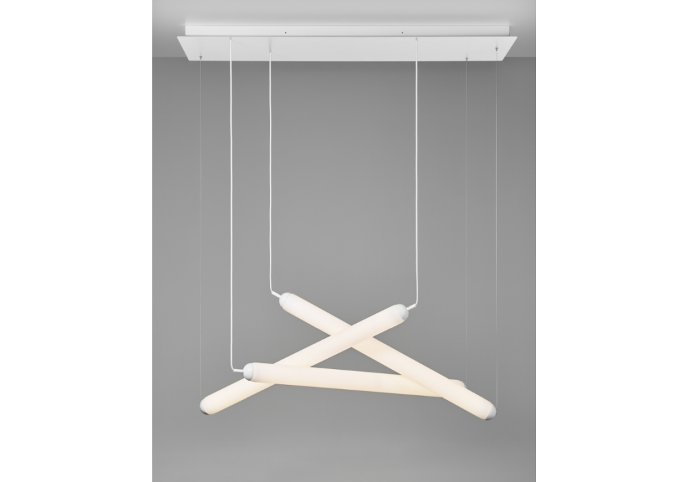 Puro Eclectic, von Lucie Koldová für Brokis entworfen, ist eine Hängeleuchte , die aus drei röhrenförmigen Elementen aus Opalglas und Metall besteht. Die gewählte Lichtquelle ist vom Typ dimmbare LED, die von einem weißen oder schwarzen Textilfaserkabel gespeist wird. Puro Eclectic ist in verschiedenen Ausführungen und Größen erhältlich.