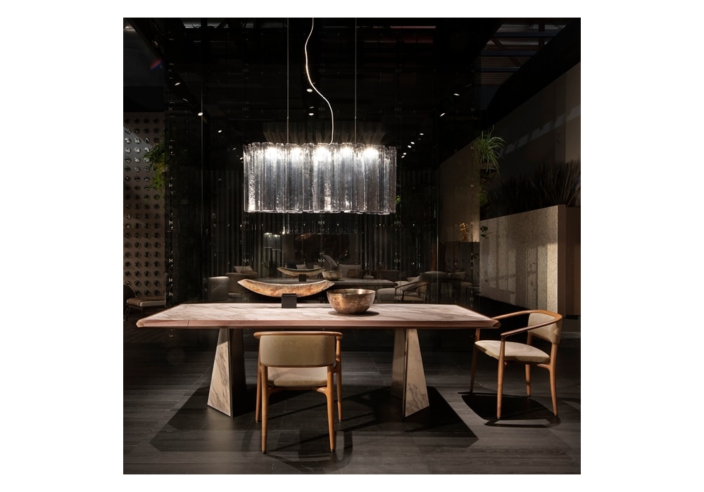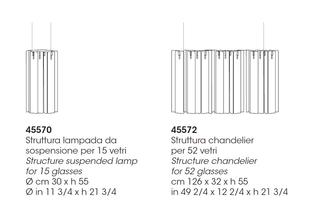 Swords für Giancarlo Bosio & Centro Ricerche Giorgetti entworfen, ist eine Hängeleuchte mit Gestell aus brüniertem Metall, die gegossene Glasscheiben mit starker Dicke und gehämmerter Oberfläche trägt. Verfügbar in Klarglas oder Rauchglas. Auch verfügbar in Kronleuchter Version. Dimmbare LED-Beleuchtung.
