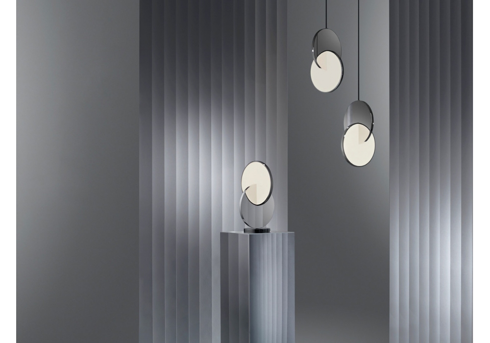 Eclipse, hergestellt und entworfen von Lee Broom, ist eine Hängeleuchte, die aus zwei Scheiben aus hochglanzpoliertem Chrom und einem Diffusor aus opalem Acryl besteht. Die gewählte Lichtquelle ist vom dimmbaren LED-Typ.