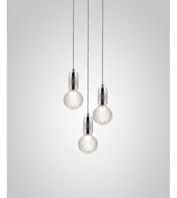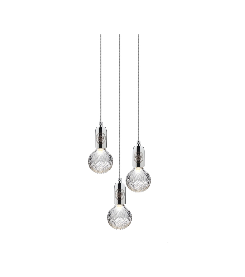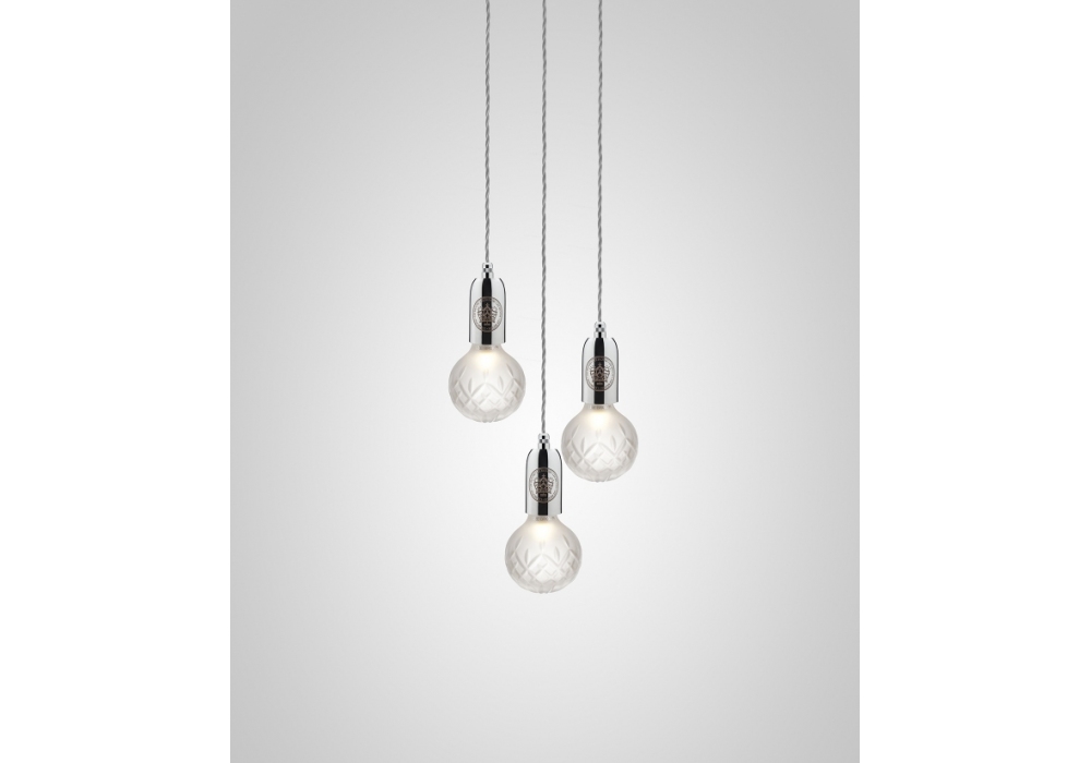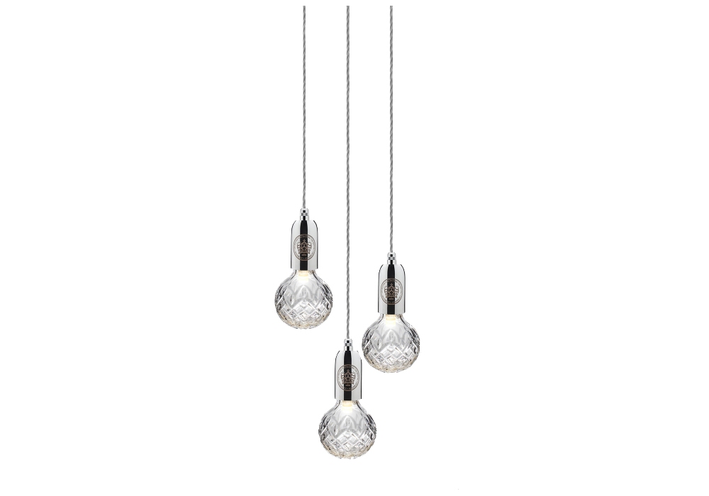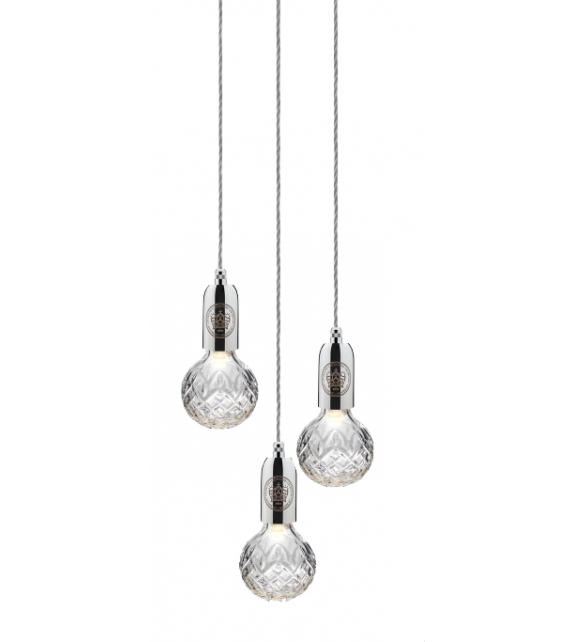 Crystal Bulb, hergestellt und entworfen von Lee Broom, ist eine Hängeleuchte mit einer runden Ankerplatte aus Stahl. Die drei Diffusoren sind aus Bleikristall, die an einem Textilseil aufgehängt sind und eine dimmbare LED-Lichtquelle abschirmen. Crystal Bulb ist in verschiedenen Ausführungen und Ausführungen erhältlich.