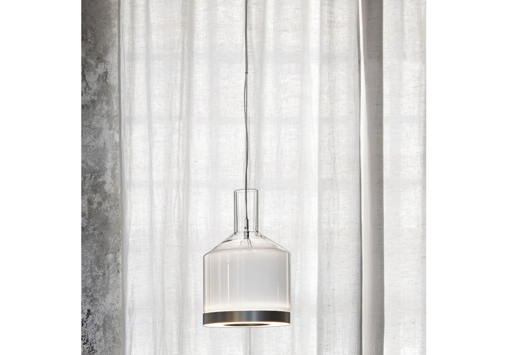 Medea Sp1 von Oriano Favaretto für Vistosi entworfen, ist eine Hängeleuchte mit Struktur aus gebürstetem Stahl. Der Diffusor ist zylindrisch aus Glas und schirmt eine dimmbare LED-Lichtquelle in verschiedenen Lichtabstufungen ab. Medea Sp1 ist in verschiedenen Ausführungen erhältlich.