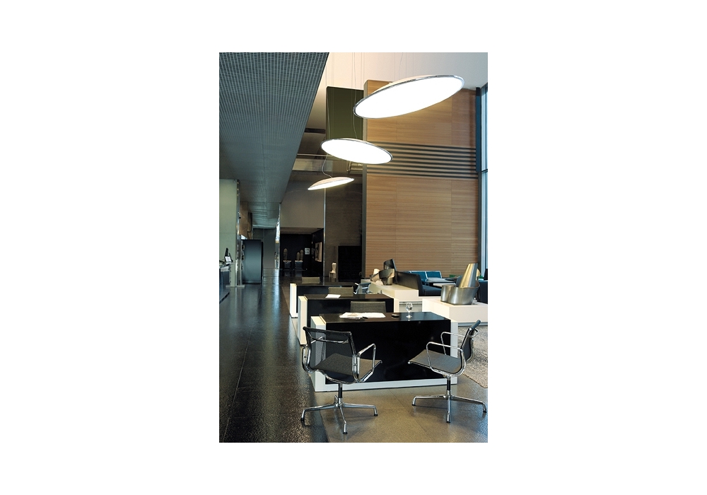 Big von Lievore, Altherr, Molina für Vibia entworfen ist eine runde Hängeleuchte mit einer tragenden Struktur aus lackiertem Stahl. Der Lampenschirm besteht aus lackiertem Aluminium mit einem Methacrylat-Diffusor und verwendet LED-Lichtquellen in verschiedenen dimmbaren oder an-aus-Versionen. Big ist in verschiedenen Größen und dimmbaren Versionen erhältlich.
