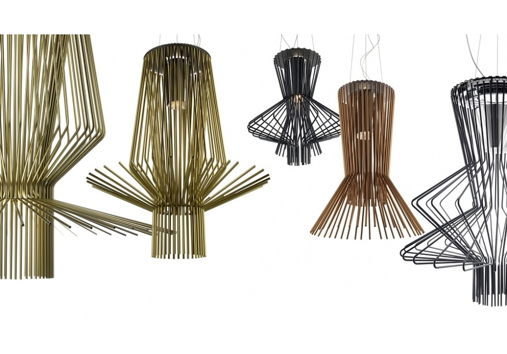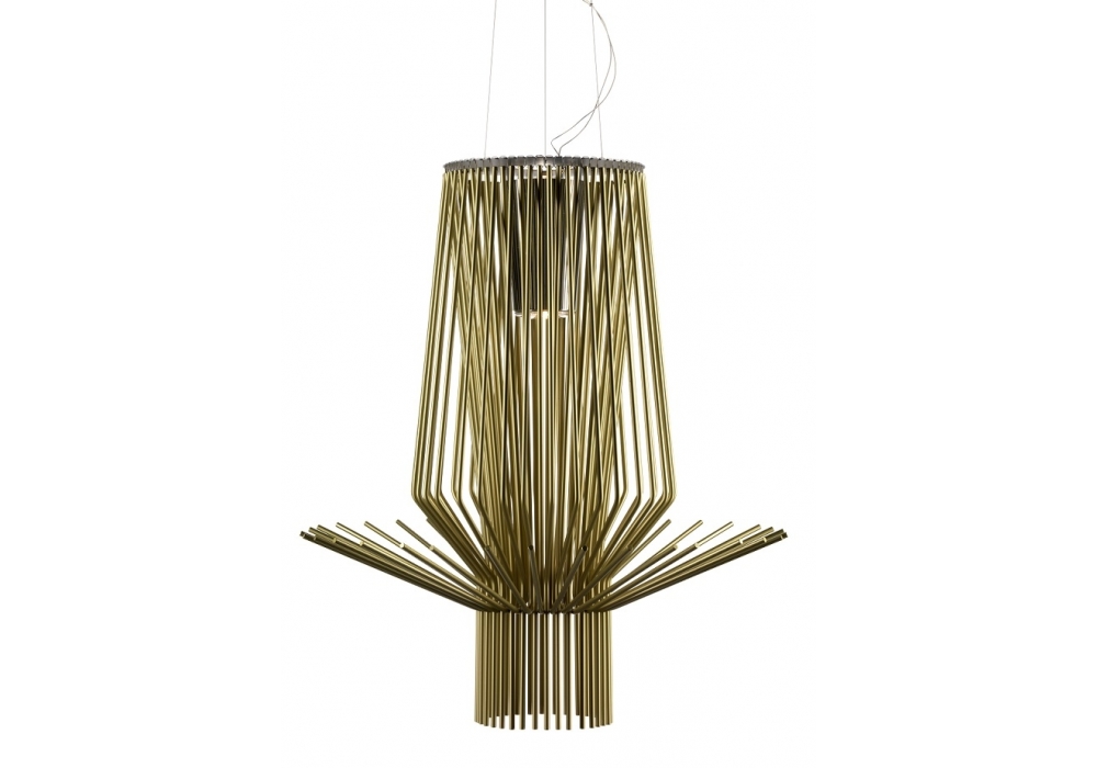 Allegretto Assai von Atelier Oï für Foscarini entworfen, ist eine Hängeleuchte aus goldfarben lackiertem Aluminium und verchromtem Metall. Als Lichtquelle wird eine E27-Fassung verwendet.