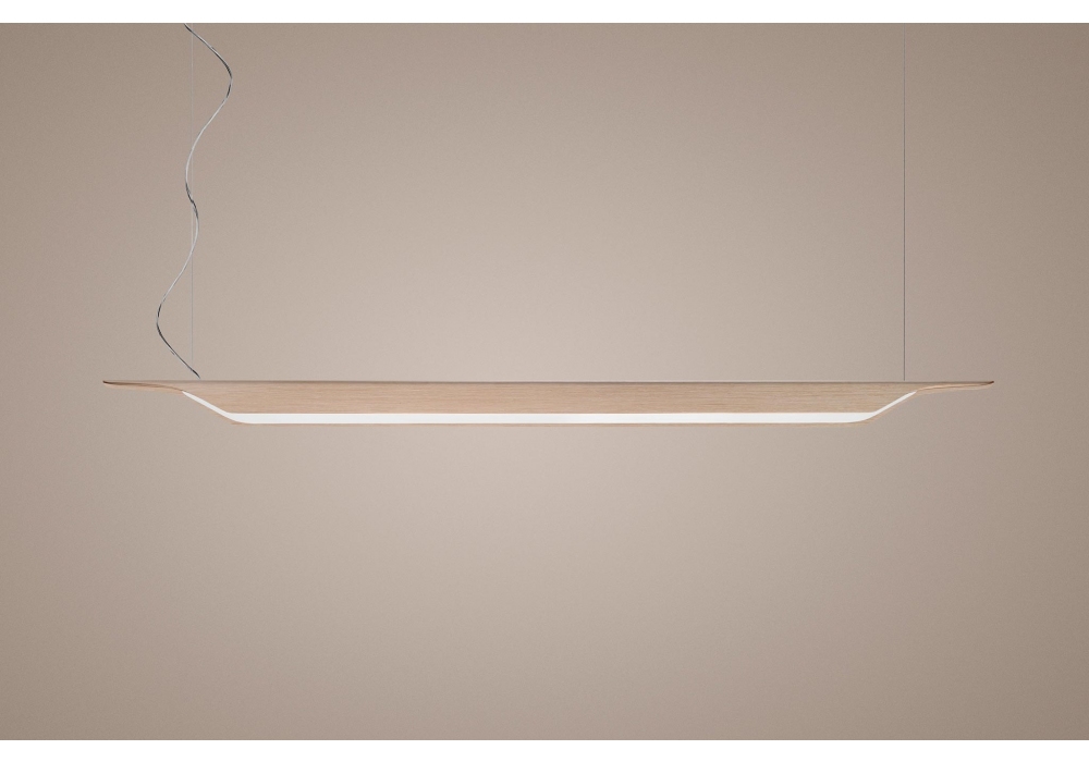 Troag, von Luca Nichetto für Foscarini entworfen, ist eine Hängeleuchte aus natürlichem Eschensperrholz. Der Diffusor ist aus PMMA und schirmt eine dimmbare LED-Lichtquelle in verschiedenen Ausführungen ab.