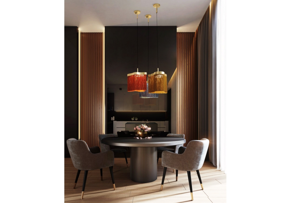 Arcipelago von Servomuto für Contardi entworfen ist eine Hängeleuchte mit tragender Struktur und kreisförmiger Rosette aus poliertem Messing. Der Lampenschirm besteht aus Stoff mit Fransen und schützt eine LED-Lichtquelle mit dimmbarem oder Standardsystem. Arcipelago ist in verschiedenen Fransenausführungen, variabler Aufhängungskabellänge und Lichtsteuerungsversionen erhältlich.