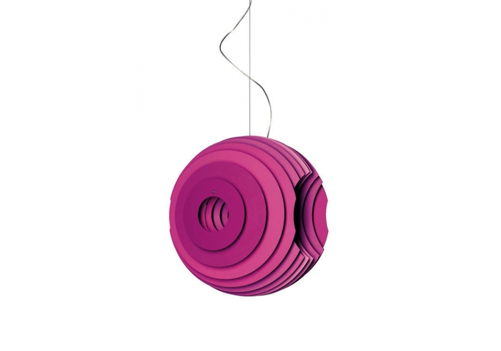 Supernova von Ferruccio Laviani für Foscarini entworfen, ist eine Hängeleuchte, die aus einer Reihe paralleler Scheiben aus naturfarbenem oder fuchsiafarben lackiertem Aluminium besteht. Als Lichtquelle wird eine E27-Fassung verwendet.