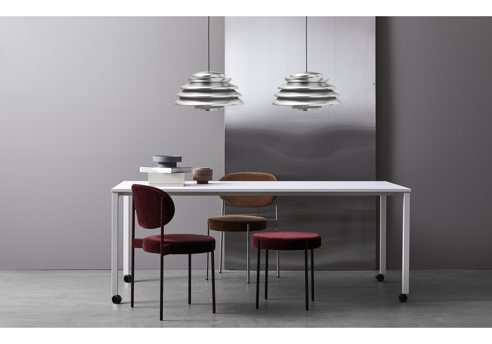 Hive von Verner Panton für Verpan entworfen, ist eine Hängeleuchte, die direktes Licht und geschichtete Schirme spendet, die das Licht im ganzen Raum streuen. Hergestellt aus poliertem Aluminium oder lackiertem Metall. Rosette passend zum Diffusor. Verfügbar in mehreren Ausführungen.
